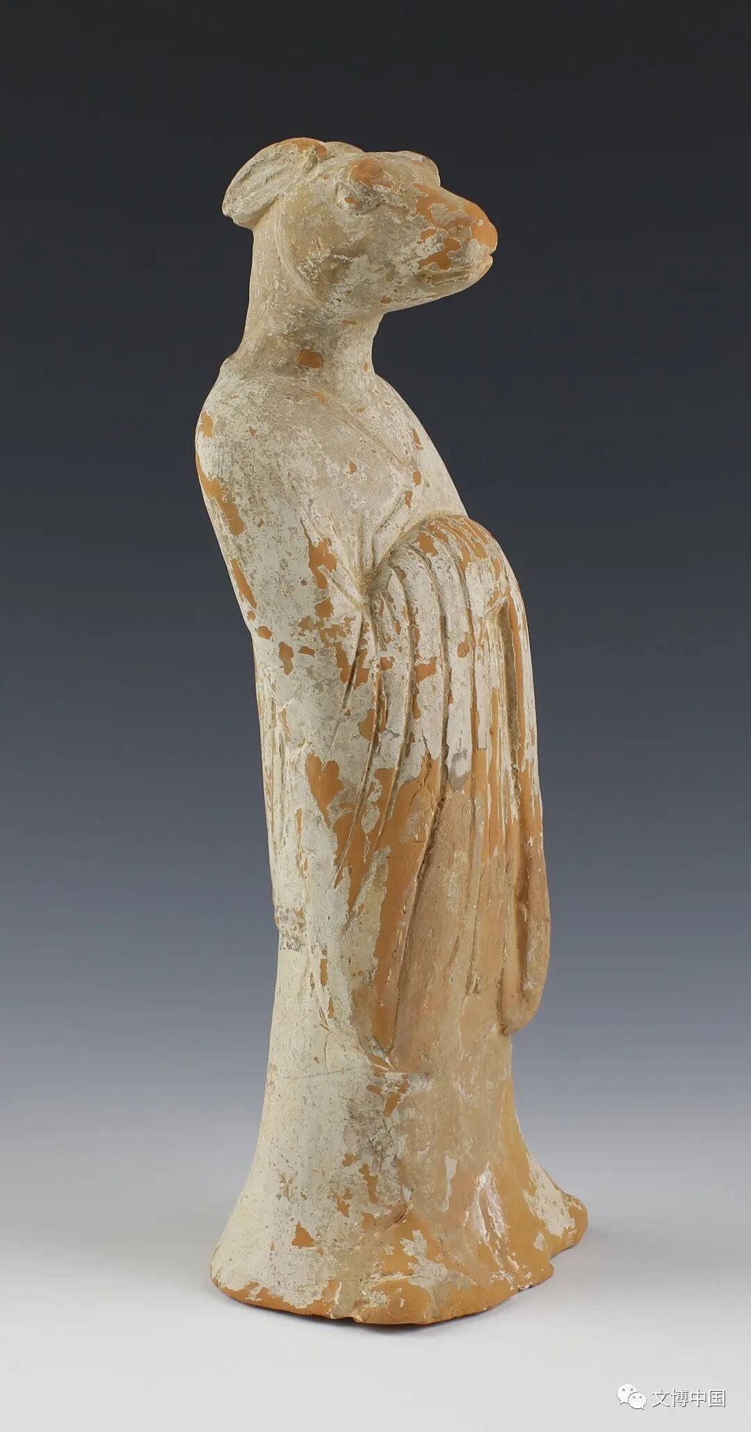 唐代的陶质生肖兔俑,兔首人身,兔头上两耳后垂,双眼圆睁,嘴巴并拢,身穿 长袍,衣袖宽大,双手相交于胸前(图5)。