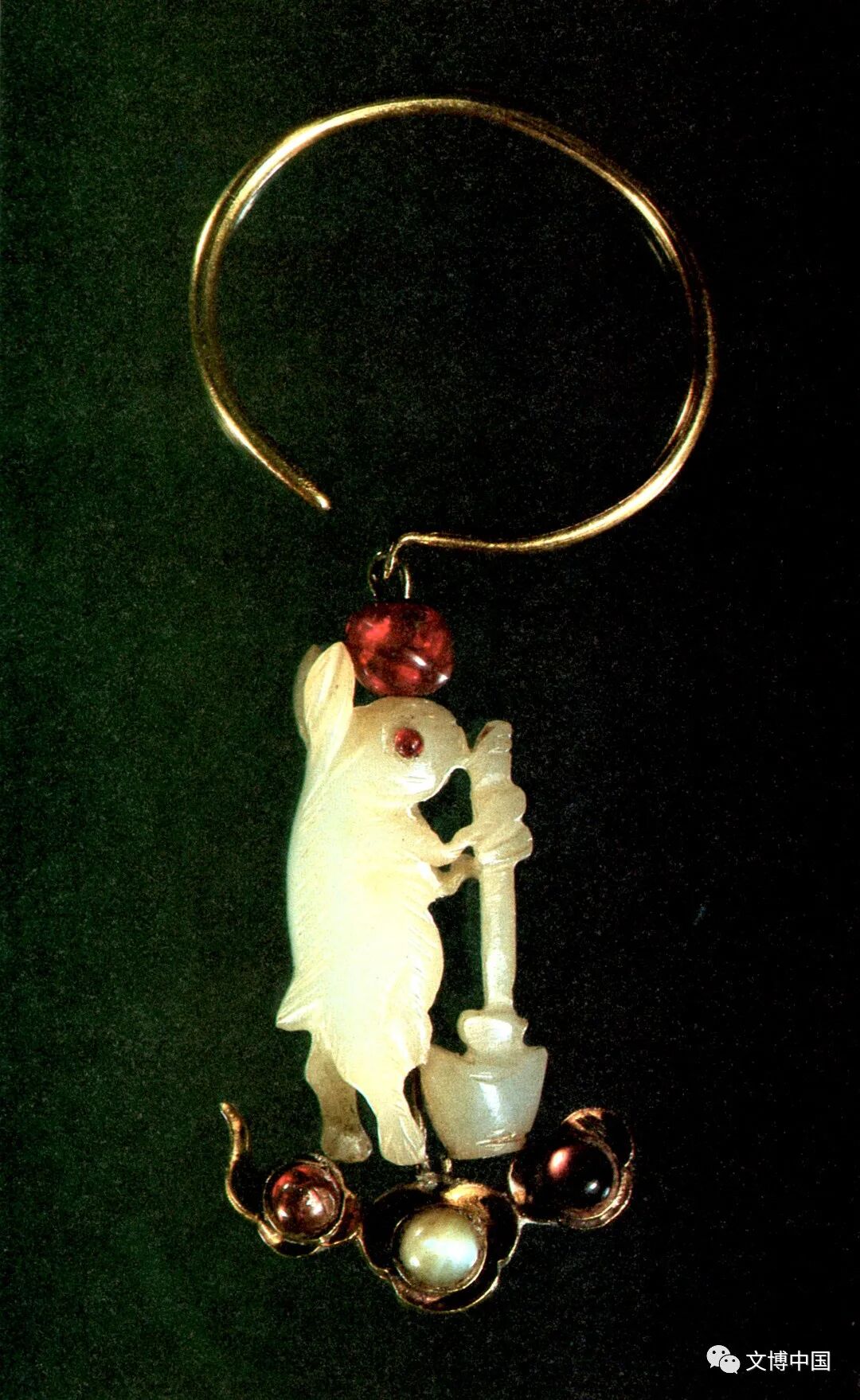 在北京市昌平区明代定陵孝靖皇后的棺内出土有一对明代金耳环下系镶宝石玉兔耳坠。耳坠中的兔子头顶一颗红宝石,身子呈直立状,双耳上竖,以红宝石嵌饰双眼,两前爪抱杵作捣药状,下有臼,兔身上刻以细密阴线,显示兔毛,在兔足和臼的下方有金托三个,金托中心嵌猫眼石,两边各嵌红宝石。这对耳坠是以玉兔捣药题材设计制作的,而玉兔在古代被视为月亮的象征,而月亮又象征皇后,故以此作为皇后的耳饰(图3)。