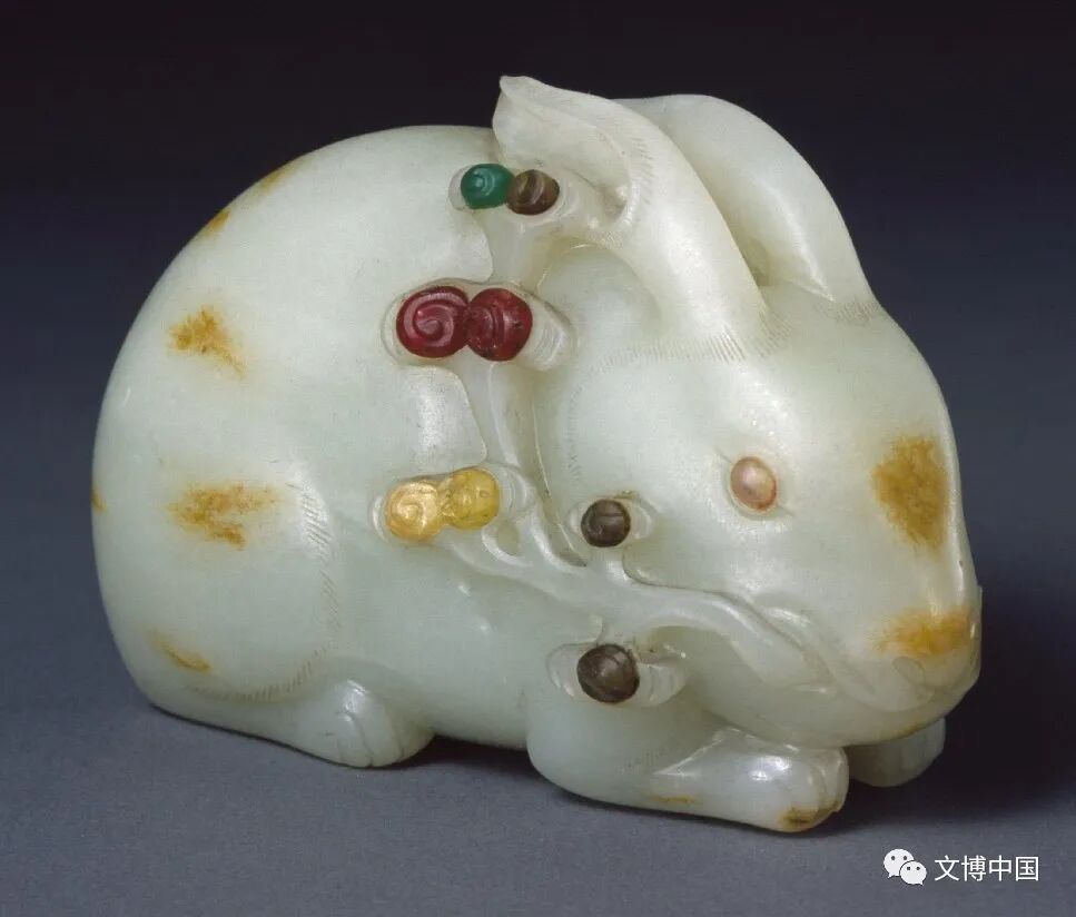 故宫博物院收藏的玉嵌宝石卧兔系清代乾隆至嘉庆年间作品。玉兔是和田青玉,含有白脑,属立体圆雕。兔头微俯, 耳朵后伸,与脊背相连,眼嵌彩色宝石, 口衔灵芝,灵芝上嵌各种颜色的宝石八颗,兔身伏卧,四足弯曲向前,前脚呈抱合状,背部、双耳处有数道阴刻线刻画出毛绒质感,形状乖巧温顺(图4)。
