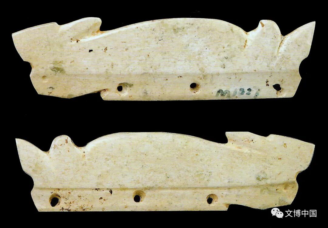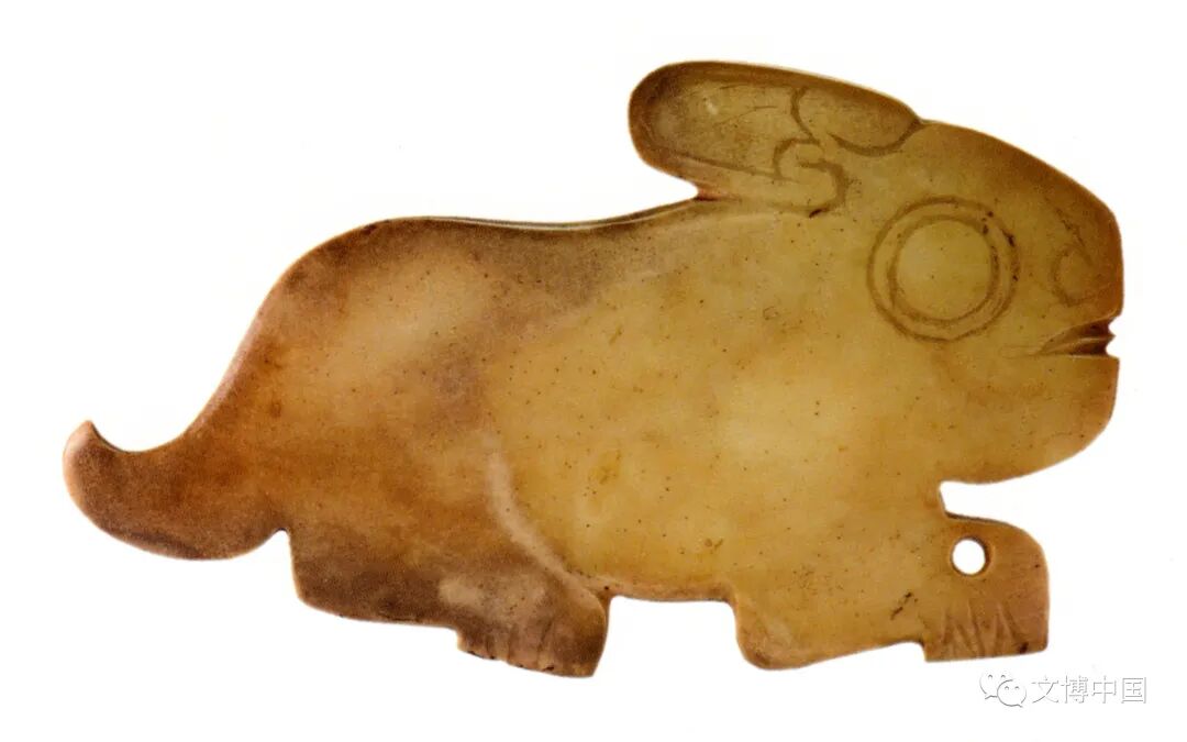 以兔子为题材或者有兔子形象的文物不多,这里先介绍玉石类的兔子。安徽省含山县凌家滩遗址 10 号墓出土的距今5000 多年前的玉兔,是迄今为止发现最早的兔形玉器。这个兔形玉器呈薄片状,玉质呈灰白色。兔头微微仰起,两耳贴在脊背上,尾巴上卷,后足抬起,似乎呈奔跑姿态(图1)。