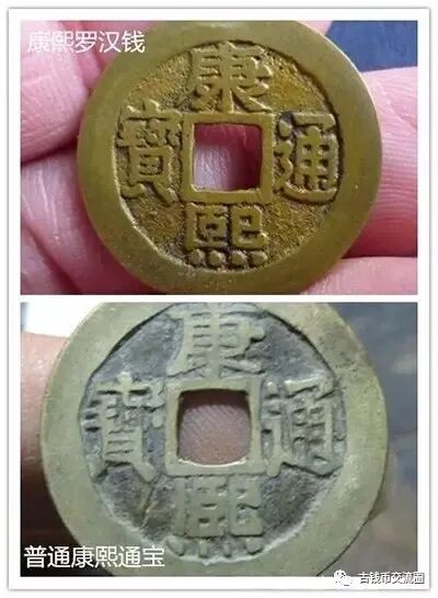说到康熙通宝,我们不得不提起大家喜爱的罗汉钱。所谓罗汉钱,指的是康熙朝所铸造钱品"康熙通宝"中的异品。与普通康熙通宝钱的区别在于,罗汉钱的"通"字的走之旁是单点,而普通康熙通宝则大多是双点;罗汉钱的"熙"字左上没有一竖,而普通"康熙通宝"则写为"熈",这一点是鉴别罗汉钱的关键。