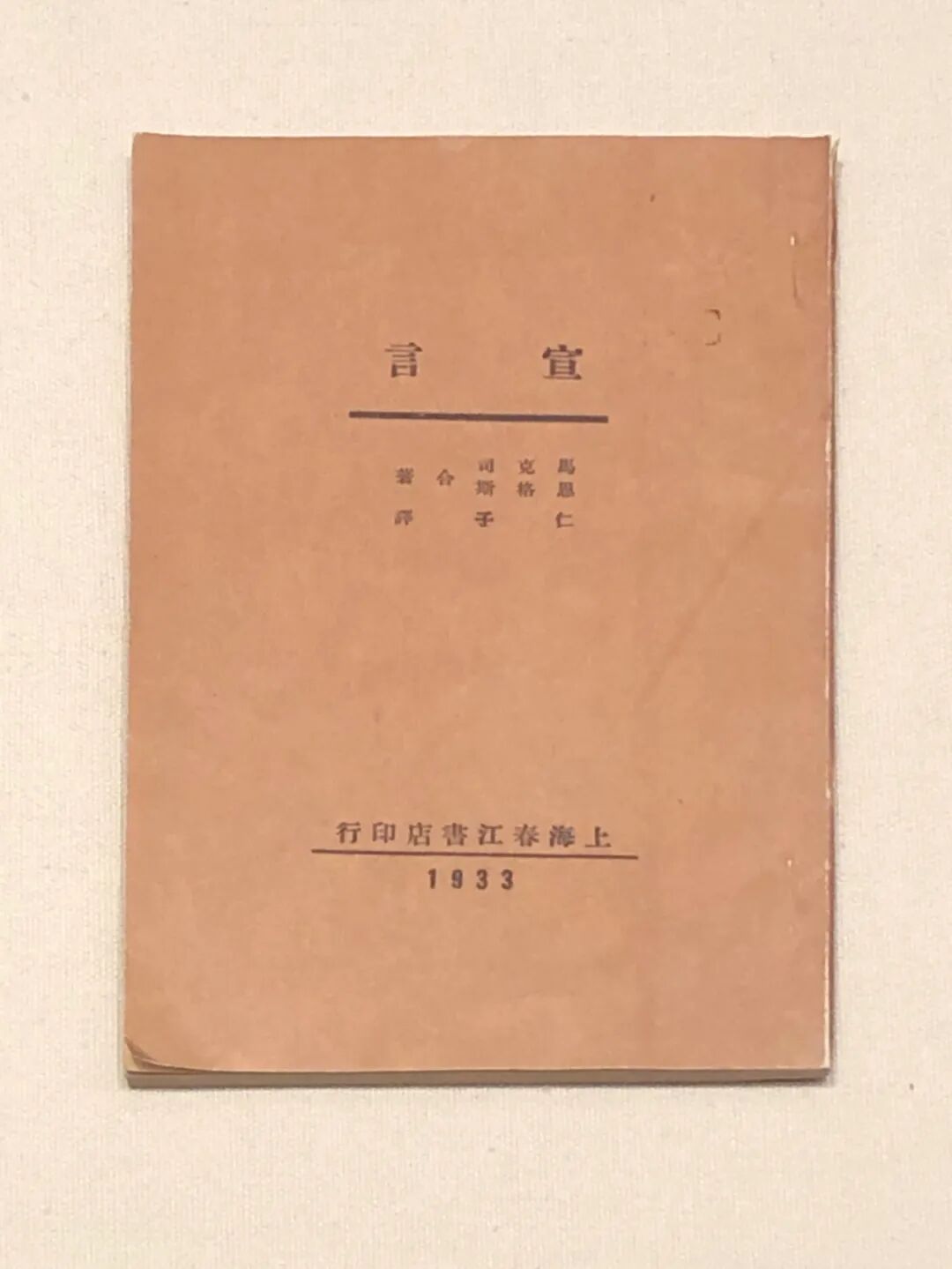 大革命失败后,反动统治者将《共产党宣言》视为洪水猛兽,妄图扼杀马克思主义。为避开反动禁控,陈望道《共产党宣言》译本的书名、译者和出版社多次更换,如译者陈望道被改为“陈佛突”“陈晓风”“仁子”,甚至省去译者。书名除《共产党宣言》,还有《宣言》《恩格斯和马克思的宣言》《马克思与恩格斯之宣言》等。此版即为伪装本,书名为《宣言》,译者为“仁子”。