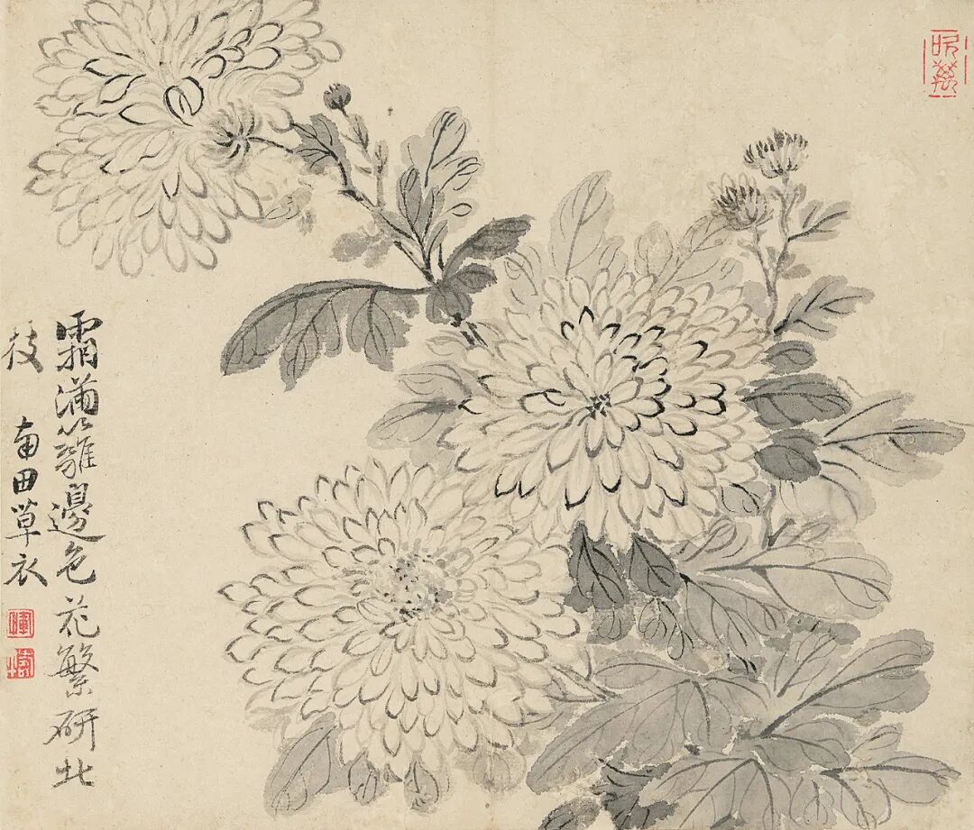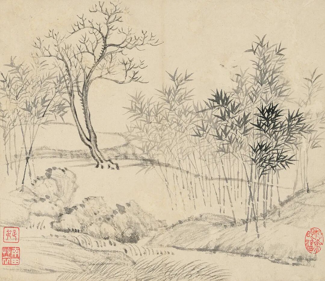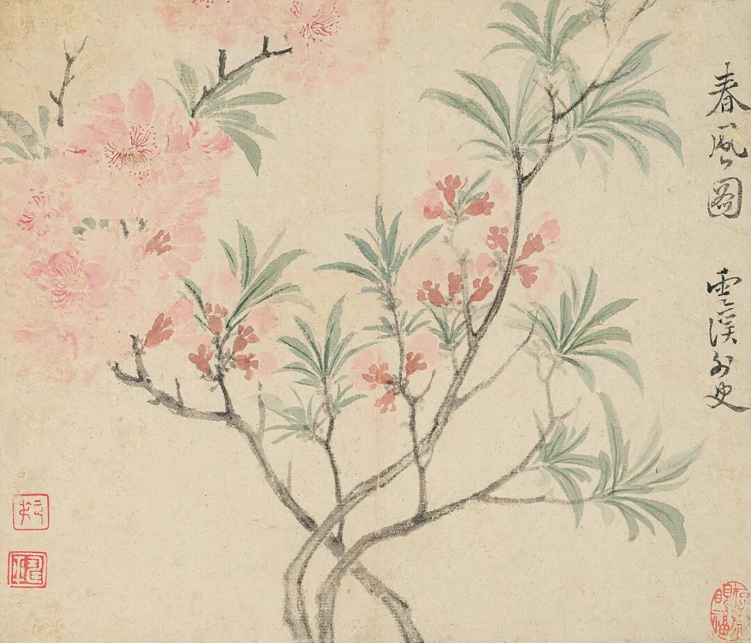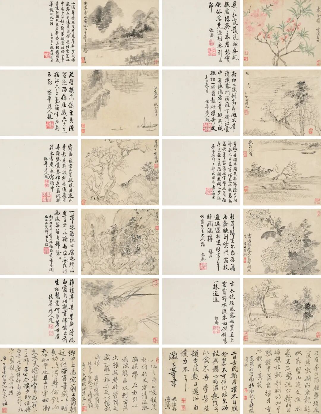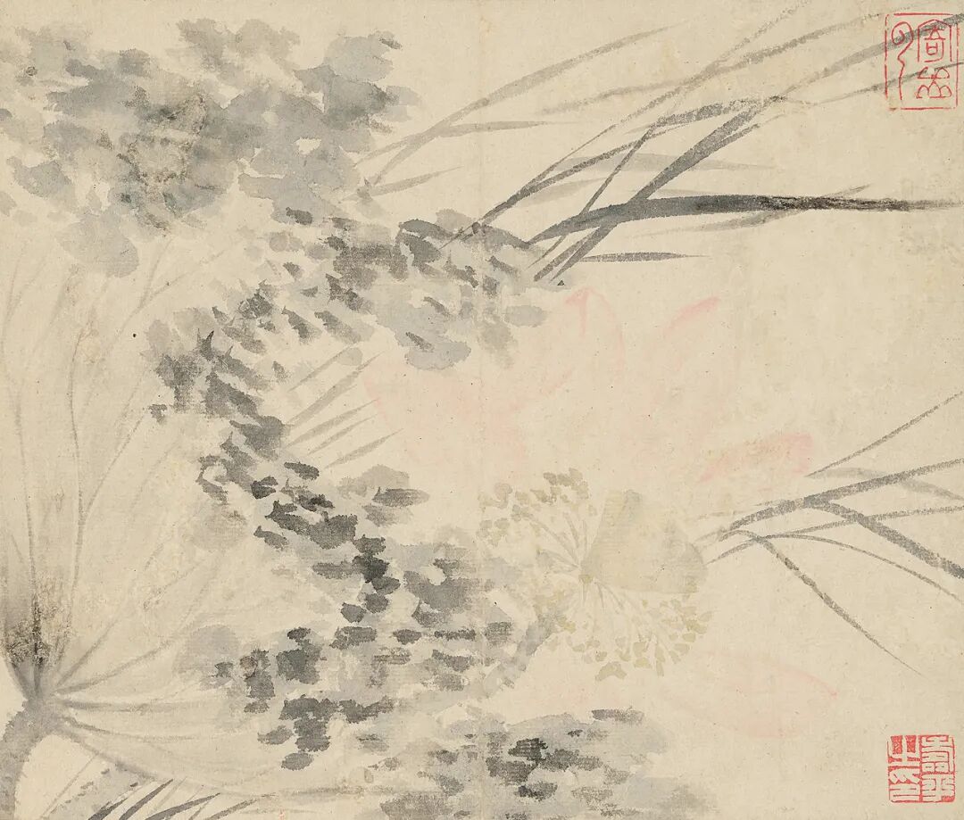 仿古之作历史上常有出现,但蔚为画坛风习则只在清初,而以“四王吴恽”为号召。但实际上,即使“四王吴恽”,他们仿古的程度和功力也不尽相同。就部分作品言,恽寿平的仿古即较四王更多出以己意、更脱略形迹,出入所仿各家也更得心应手,如《山水花卉册》。《山水花卉册》计十二开,前十开分别仿历代名家,如董源、夏圭、李成、曹云西等,其题材分别为春风桃花、夏日风荷、秋菊傲霜三开花卉和秋江钓艇(仿曹云西)、江山渔乐(仿夏圭)、古木幽篁、秋汀晚度、李晞古寒林图、米家云山、临董源七开山水,而南田平生所长,一一见于画中。桃花和荷花两开,径以没骨法绘成,设色清雅妍丽,别具风姿。《夏日风荷》一开,更以水墨点染莲叶,令人一见而觉荷风拂面。