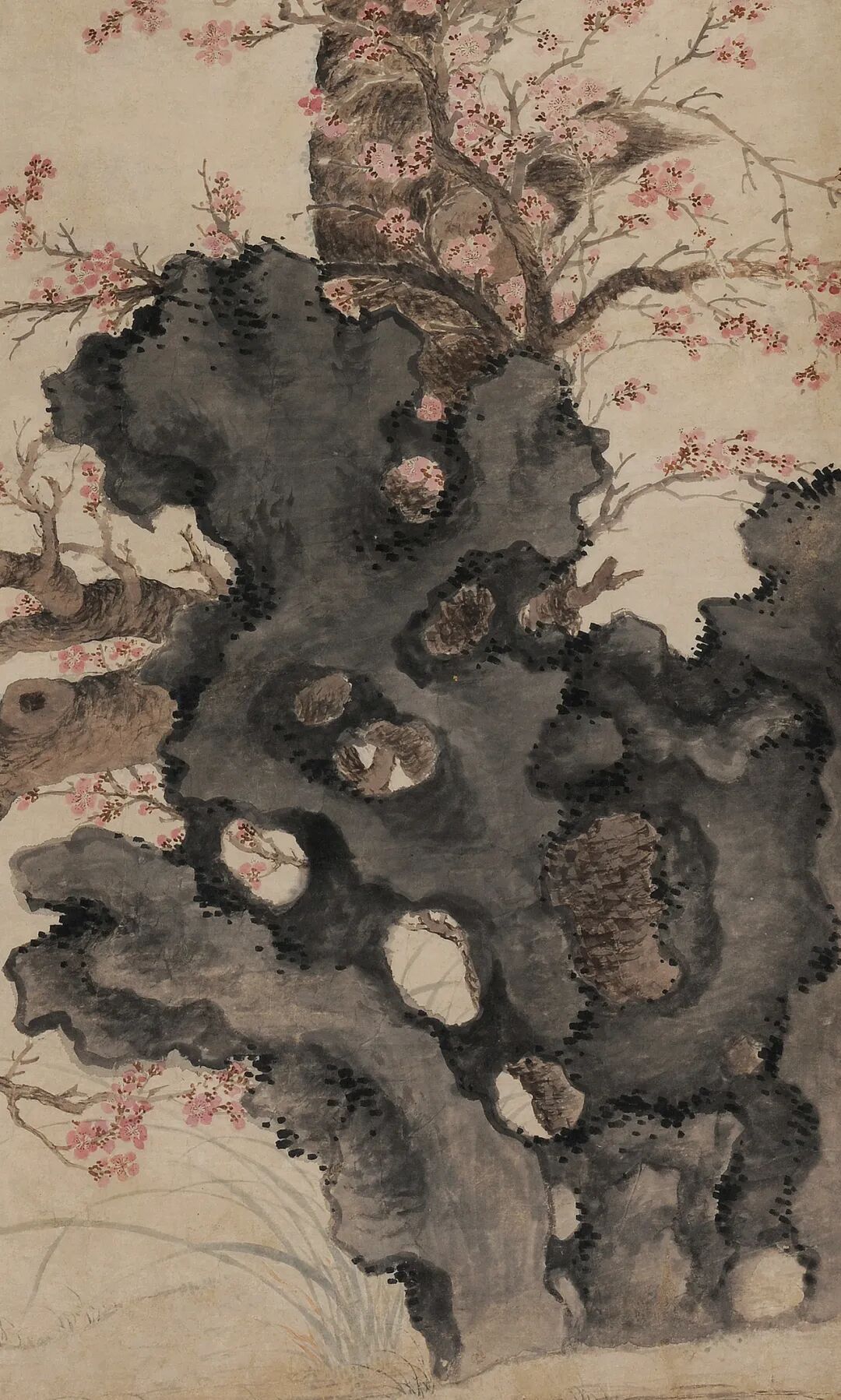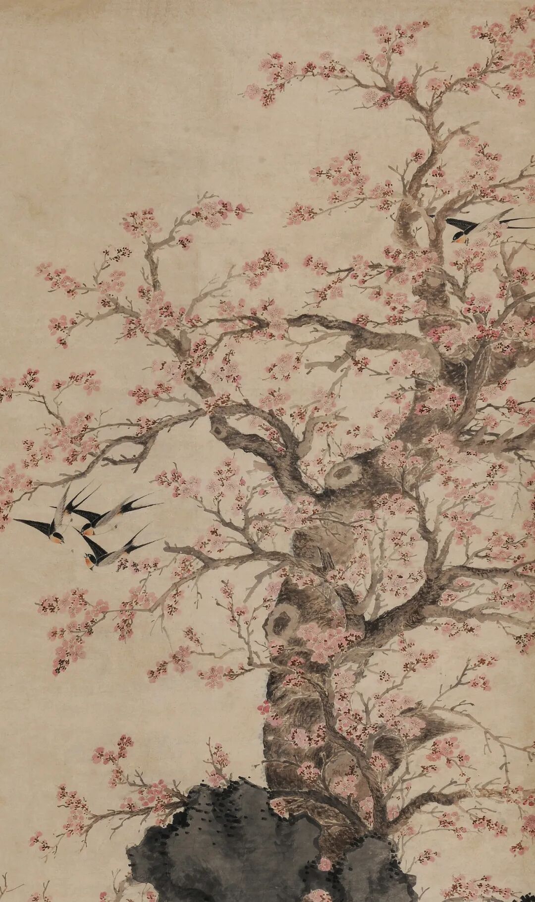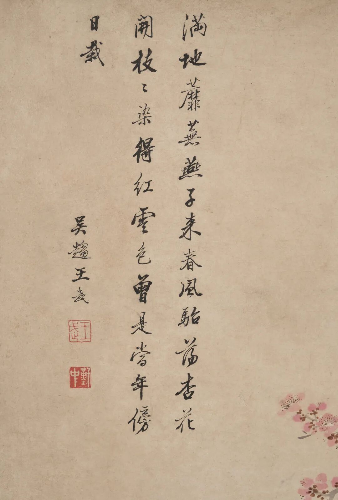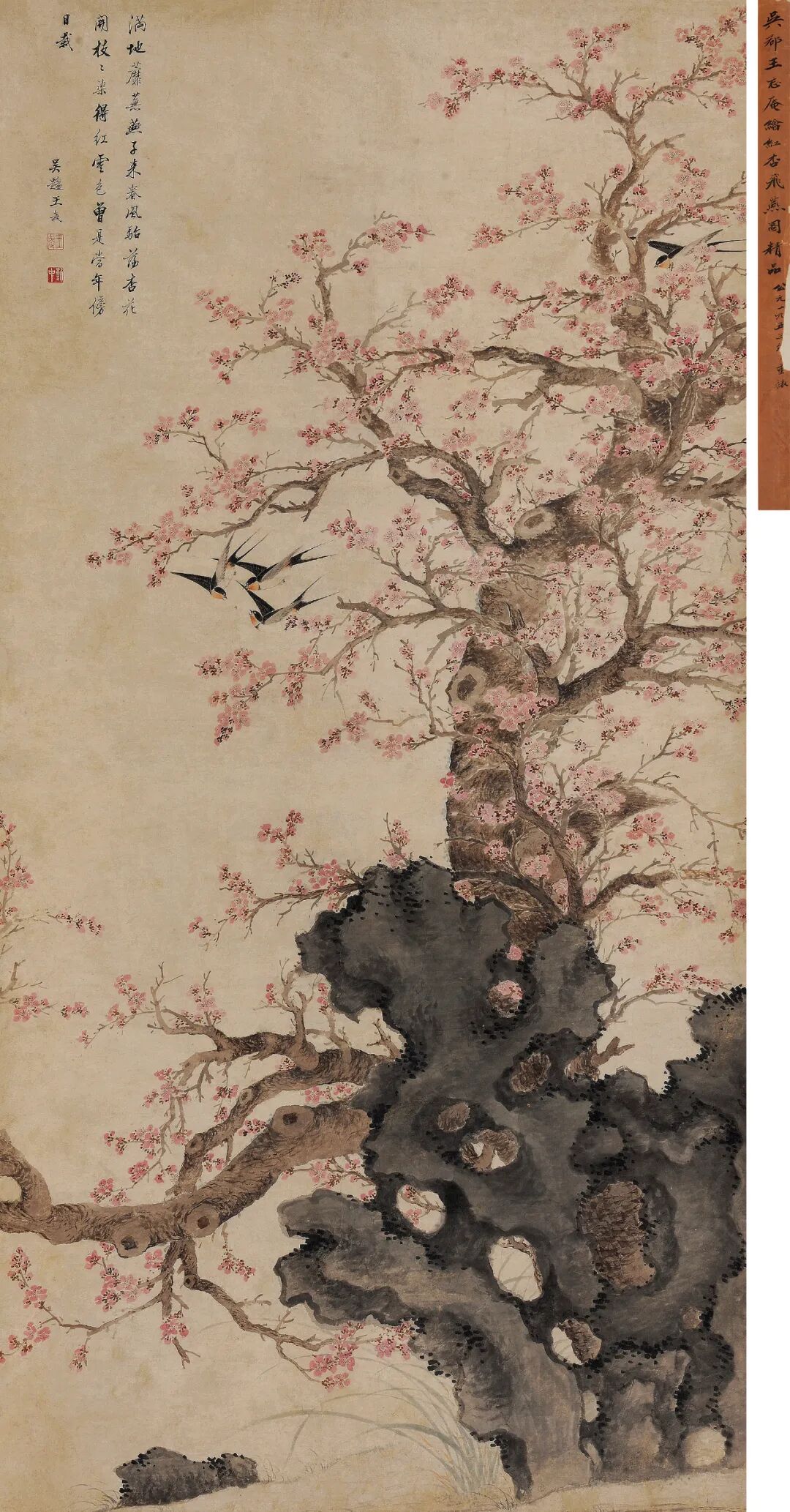 此幅《红杏飞燕》图,神韵生动,应在妙品中!此幅作品设色纸本,高195厘米,宽98厘米,为大尺幅花鸟作品,图绘灵璧石巉岩嶙峋、沟壑交错,上绘红杏枝枝芳艳,疏枝缀玉,缤纷怒放,犹如美人微醺腮红。树干虬龙盘曲,苍劲稳健,犹如君子立世,翩翩傲骨之气。红杏旁绘三只春燕,燕声远近相答,半空展翅,起舞于春风中,又与蜜蜂穿梭于杏花间。画法上,石头用没骨法,多取周之冕、陆治画法兼得恽寿平笔法,以淡墨、浓墨晕染,以分石皮阴阳,格调秀润而清逸。杏花成团成穗,花瓣以洋红烘晕,花蕊细笔蘸署红勾勒,布彩丰艳。树干用赭石含墨皴擦,色中有墨,墨中有色。春燕乘春扑香而来,眼部、嘴部、爪部,细节勾勒精妙入微。画面左边款题:“满地蘼芜燕子来,春风骀荡杏花开。枝枝染得红云色,曾是当年傍日栽。吴趋王武。”钤印:王武、勤中,此二印收录于上海博物馆编《中国书画家印鉴款识》第35页,王武印鉴第54、55方。与之相似作品如:上海博物馆藏《花鸟图》册、浙江省博物馆《杏花春燕》扇面等,皆为精品之作。![]()
