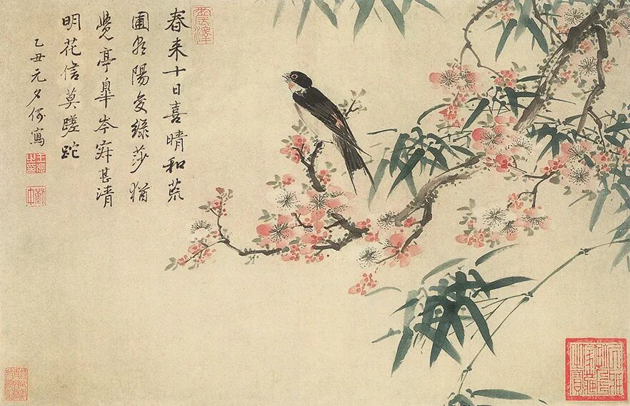 王武(1632-1690),字勤中,晚号忘庵,又号雪颠道人,吴县(今江苏苏州)人。明代画家王鏊六世孙,精鉴赏,富收藏,擅画花鸟,风格工整秀丽,正如王时敏所云:“神韵生动,应在妙品中。”为清初院画的名家。清代花鸟画多以写真为本,在续承元、明以来花鸟画的趋势下,更加追求笔情墨趣,注重自然界花树的特征。清代花鸟大家恽寿平论:“写生之技,即以古人为师,犹未能臻至妙,必因而师移造化,庶几极妍尽态而为大雅之宗。”强调花鸟画应不落恒畦,不入时趋,独辟奇境,下笔灵变。王武则是受到恽寿平影响最深的一位画家,他既有传统的临摹写生功底,又有以“万物为师,以生机为运”的绘画理念,十五岁已能作巨幅画,“使观者叹绝其妙”。评者以为前辈陈淳、陆治“不能过也”。![]()