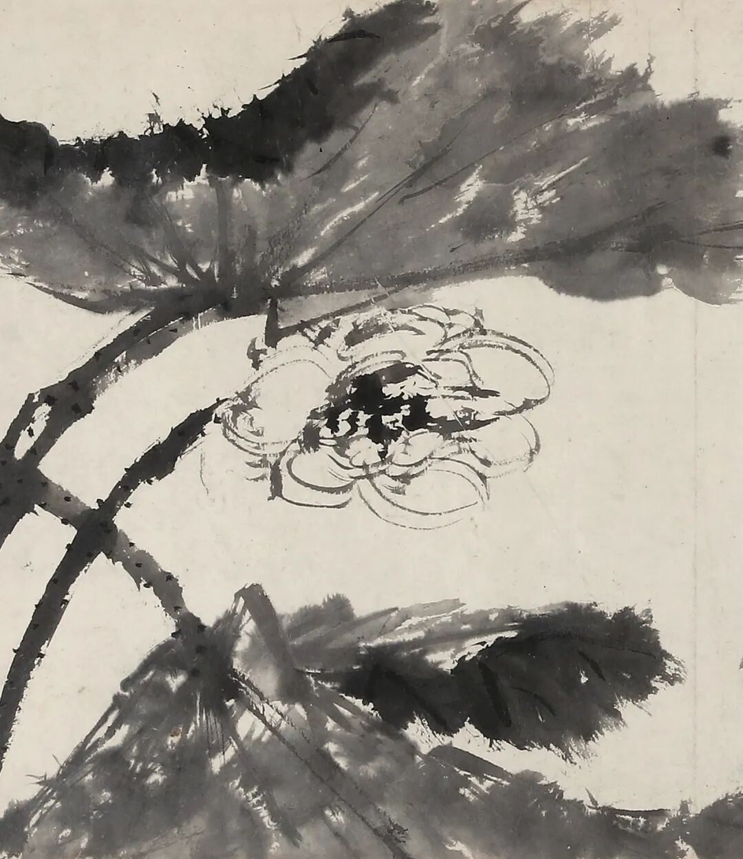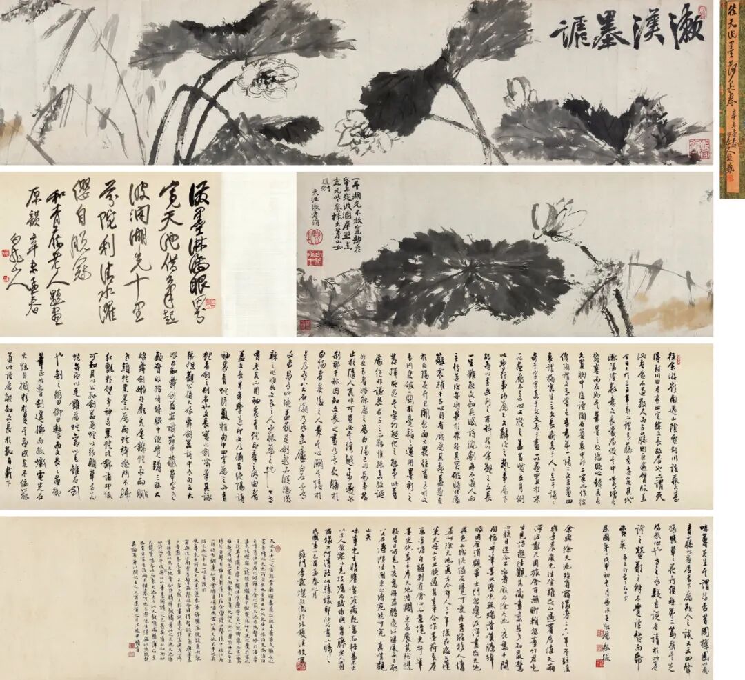本件徐渭绘《漱汉墨谑图卷》集诗、书、画、印为一身,一腔激越的纵横之气和豪放境界泼洒跃出。花卉是他惯用的“枝淡叶浓,逸笔草草”与“一花半叶”的技法特点,泼墨、破墨、积墨等多种技法随意挥洒,把墨的五色,六彩运用到了极致。荷叶以肆意的用笔注于笔端,弥漫喷薄出一股自由不羁的豪情,一气呵成。自题诗:“一斗湖光不放宽,却于纸上定波澜。犀盘黑尽无些蜜,捧出茅山女道冠。”用笔沉着浑圆,飞动跳跃的笔法又有米芾的意趣,与画两相映发。Lot 2082