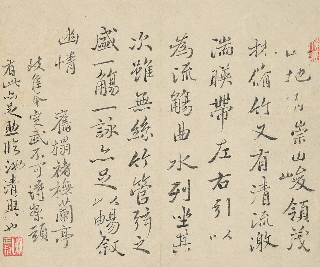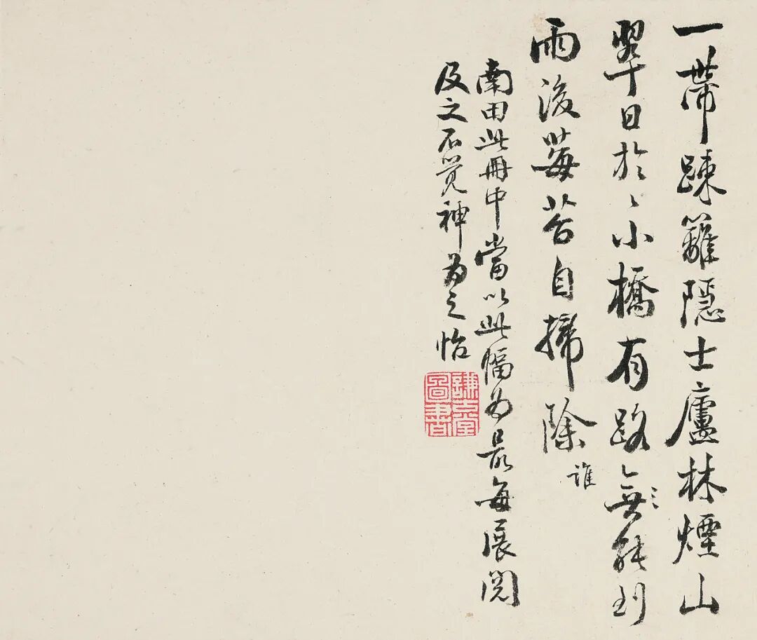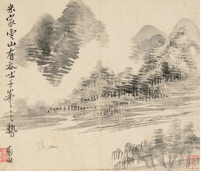 尽管南田曾“自认”山水不及石谷,有“是道让兄独步矣。格妄耻为天下第二手”之语,并随之弃山水而习花卉,但事实上他自己并没有将自己从“独步”之列划出,一个让字已多少表明南田心中所想。因此后来才有秦祖永、钱松、郑午昌和黄宾虹等为南田山水艺术翻案。黄宾虹说:“南田山水浸淫宋元山水诸家,得其精蕴,每于荒率秀润之致,逸韵天成,非石谷所能及也”,其意更为明确。观南田此册中七开山水,可知黄宾虹此言不差。七开山水中,明确题为仿作的有五开,但将这些“仿作”与原作一对照,立刻可知南田仿作其实是出以己心,是真正的所谓“以意为之”“得鱼忘筌”之作。如题为“临董源”的一开,看来极为荒率,但却秀润之极,充满了有心于自然的诱惑。