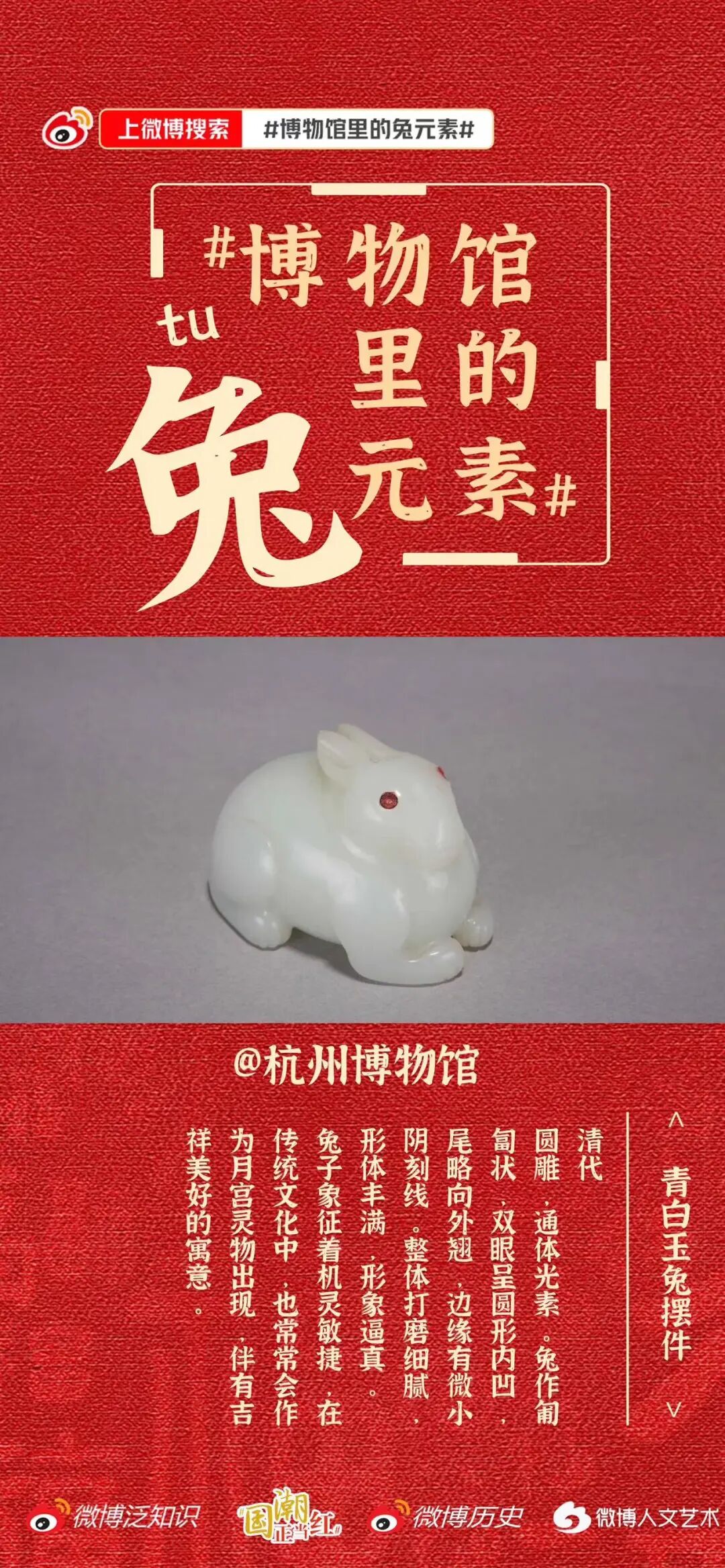 参与方式:转发“微博历史”相关活动微博,一起来“兔年话兔”,分享#博物馆里的兔元素##国潮正当红#,正月初一将由“微博历史”抽取1位幸运儿送出博物馆文创大礼包一份。![]()