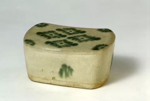 白釉绿彩枕,高9.5cm,长16.5cm,宽10cm。