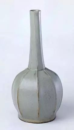 瓶直口,长颈,腹部呈八棱形,圈足外侈。灰白色胎,质致密。釉呈浅青绿色,唐人陆龟蒙诗云:“九秋风露越窑开,夺得千峰翠色来”,道出了越窑青瓷的釉色特点。