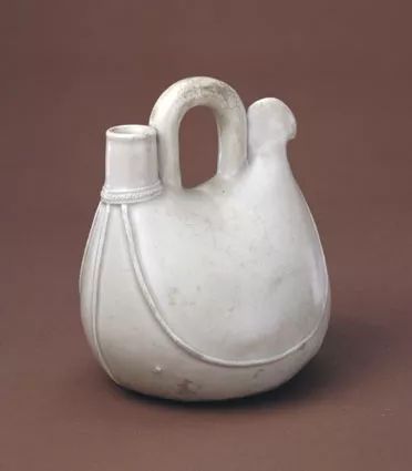 邢窑白釉皮囊式壶,唐,通高12.5cm,口径2.2cm,底径12.5cm。