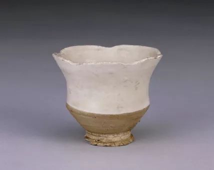 白釉葵瓣口杯,高6.2cm,口径7.5cm,足径3.4cm。