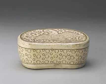 五代时期的越窑青瓷质地细腻,胎体轻薄,釉面光滑,造型趋于秀美,刻花技法更加成熟。这件越窑刻花盒为五代时的瓷器精品,器物施满釉,釉薄而匀,明显与唐代越窑不同。五代时期,更多地注重花纹装饰,刻花、印花、划花技术发展到了高度成熟的阶段。装饰题材进一步拓宽,人物、鸟兽、花草一应俱全,其莲瓣纹是越窑瓷器装饰中最有代表性的纹饰,莲瓣宽厚肥硕,有的花瓣中还有脉络,花瓣层次重叠者居多,单层者较少。此盒所刻莲瓣线条圆润,刀工犀利,技艺娴熟,富有真实感,显示出越窑装饰的发展与成熟。