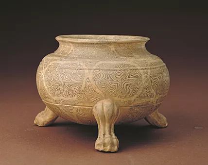 罐口外卷,圆腹,下承以三兽足。此罐通体绞胎,以两种颜色胎泥绞出木理纹样,并以团花形式表现,是绞胎器物中难得的佳作。