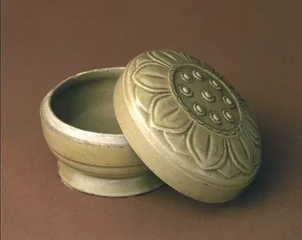 盒直口,外撇圈足。盒盖面坦平,直口。盖面刻花,中心为一莲蓬,外环莲瓣一周,盖边与盒底中腰各有弦纹一道,盒里外及足内满釉,釉呈青黄色。