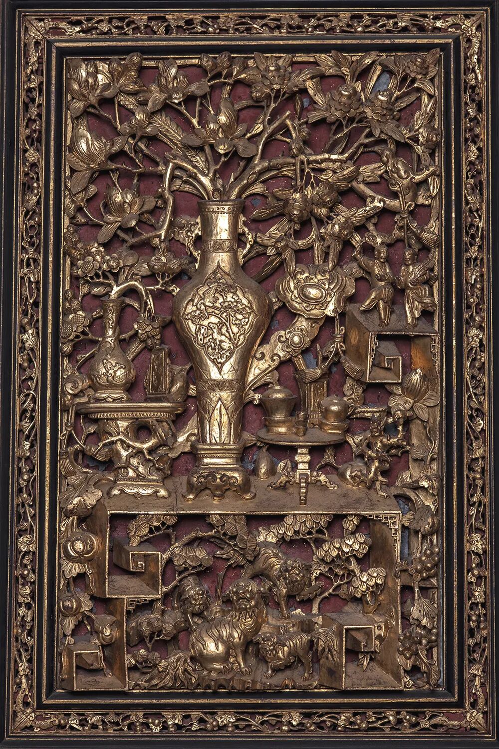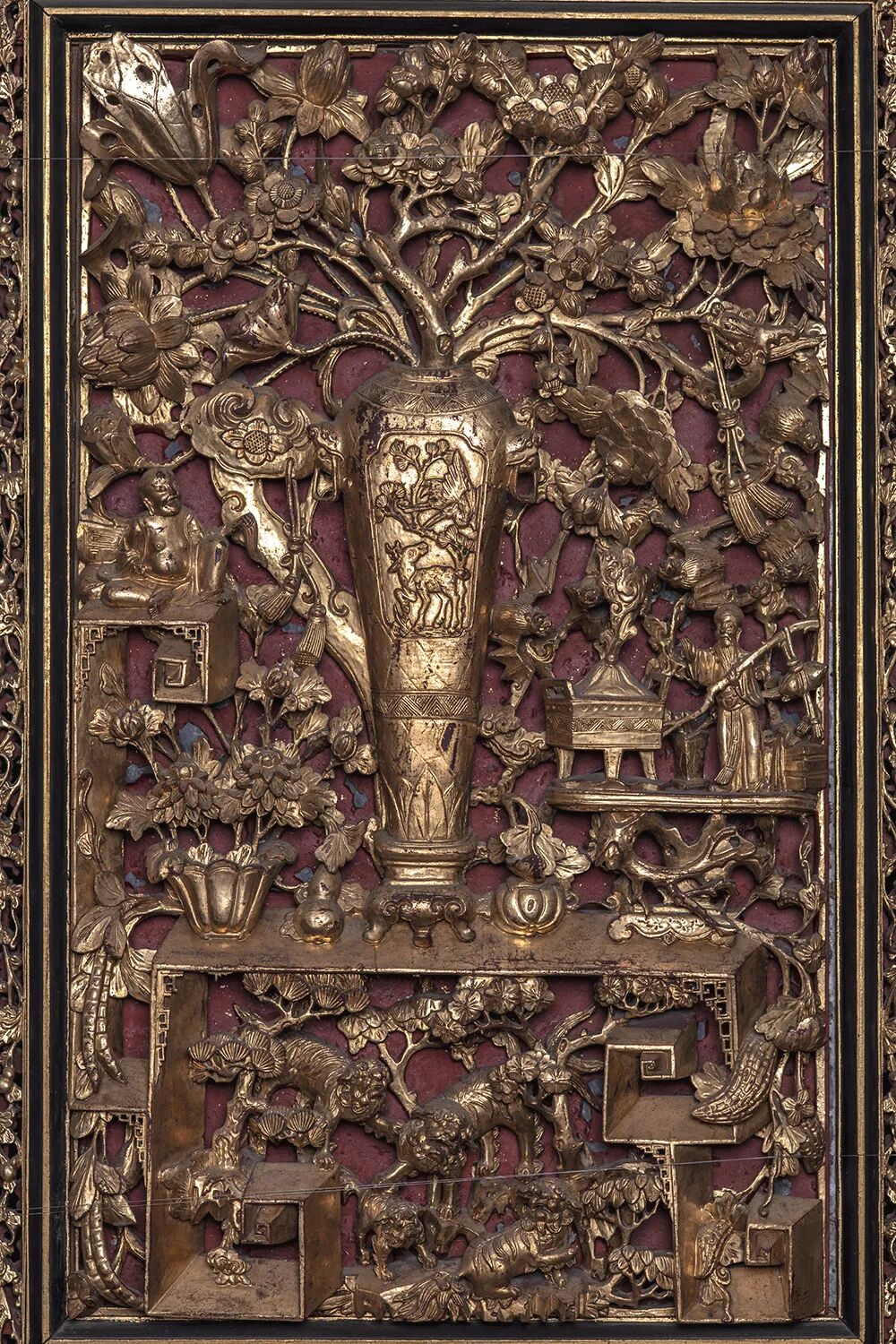 潮州木雕是我国主要木雕流派之一,流行于粤东,以其极尽精致的雕刻和髹漆贴金的工艺而独具特色,具有金碧辉煌、富贵华丽的艺术效果。其起源至迟可追溯到唐宋时期,经过明代的发展,至清代达到鼎盛。潮州木雕应用广泛,涵盖建筑装饰、礼祭器具和家具陈设等方面,以宗祠家庙建筑装饰和祭祀用的礼器装饰最为大宗和精致。