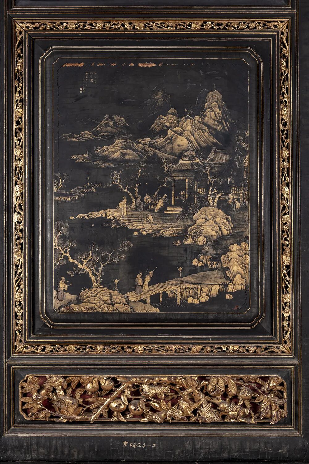 这件神龛的两扇门由十二部分装饰而成,龛门正背面和龛内框栏、龛楣、楣栅,镂通雕人物故事、潮剧戏出、花鸟鱼虫、博古炉瓶等题材。龛后壁绘金漆画围屏,上部绘山水、人物和亭台楼阁等图案,下部绘仙鹤、喜鹊等祥禽瑞兽以及瓶花、香炉等图案。这些寓意着富贵吉祥、幸福喜庆的纹样,寄托了人们对美好生活的向往和追求。