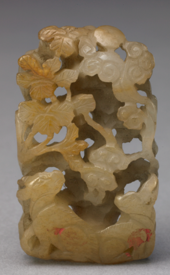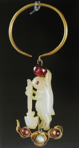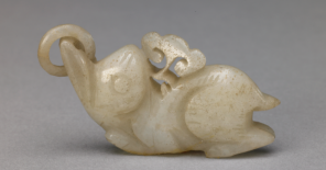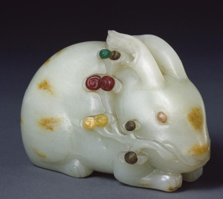 除此以外,仿前代的“双兔望月”及“玉兔捣药”“鹰逐兔”题材也得到人们的喜爱,尤其是嵌宝石的玉兔,更加具有明清大一统的时代特征。