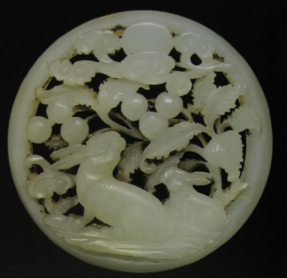 元代的玉兔,创作题材更加丰富多样。以透雕绘制的“玉图画”,圆月高悬,祥云之下,柞树下双兔望月,简单而美好。