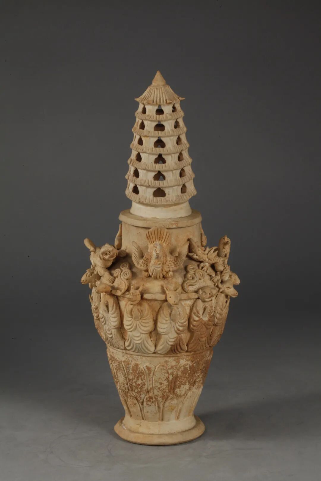 作为随葬十二生肖俑的延续,魂瓶上的堆塑生肖形象始见于北宋晚期,起初仍多保留兽首人身的传统,随后便衍生出完全人形化的人物形式,瓶颈加长,镇墓神煞类装饰愈加复杂。此瓶肩上所饰一周人物即由传统的生肖形象演变而来,动物特征已经消失。