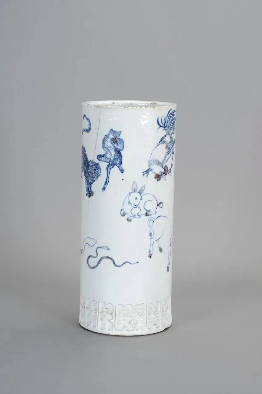 帽筒创制于清嘉庆时期,同治、光绪年间开始流行并普及,原为清代官员上朝前置放花翎顶带所用,兼具实用和陈设性。此件帽筒以青花勾勒出十二生肖的动物形象,饰以釉里红点缀细部,生肖艺术造型简单、活泼,可谓别具匠心。