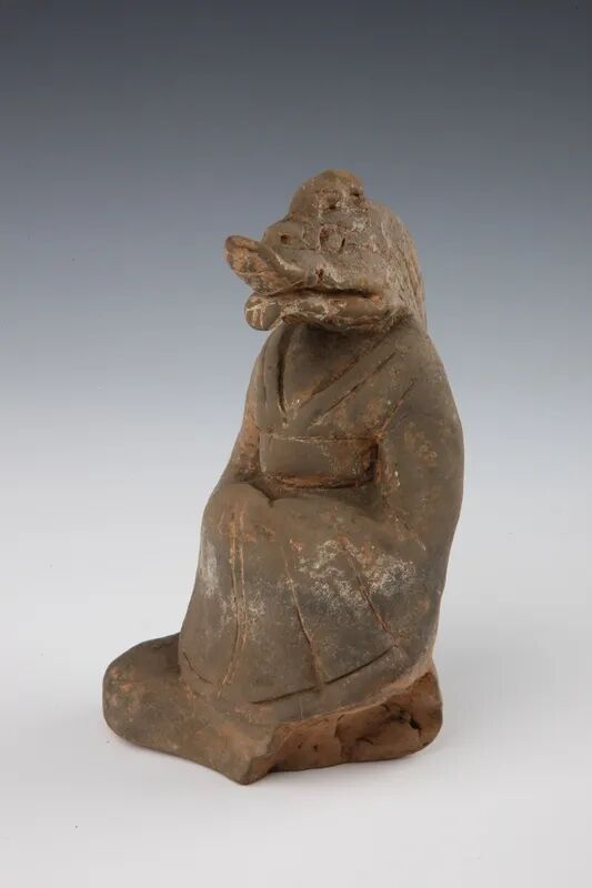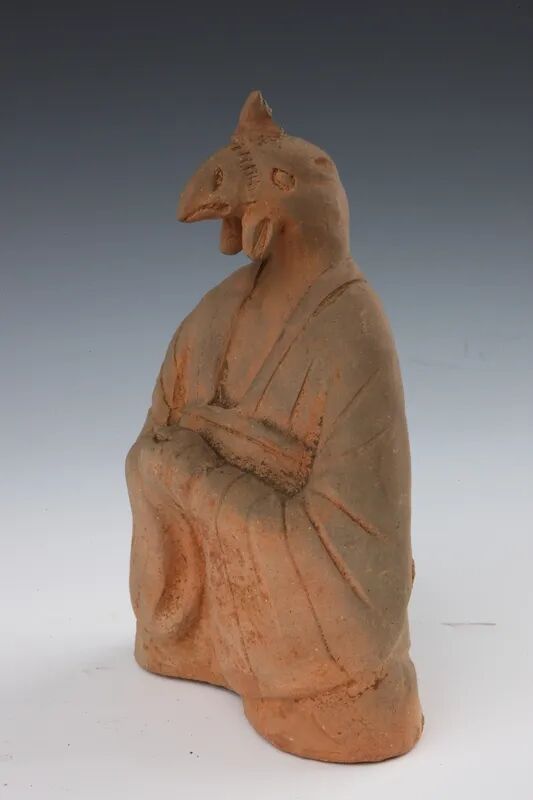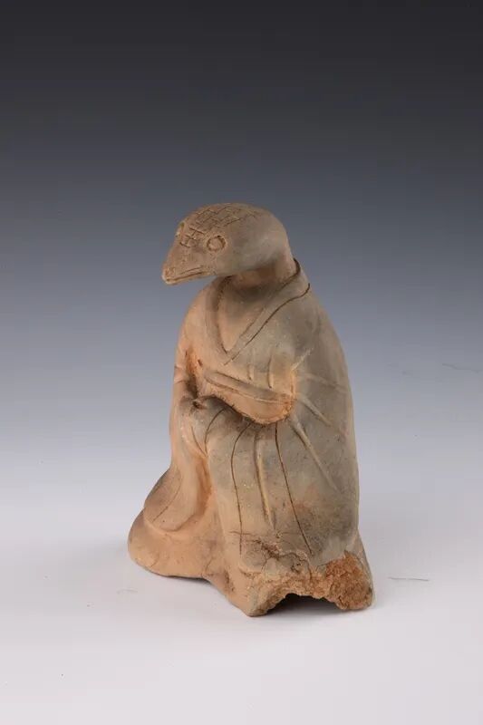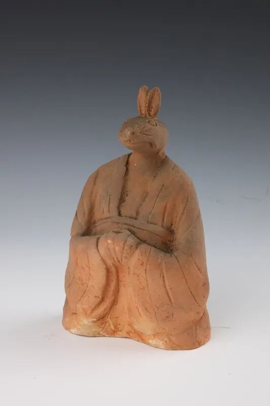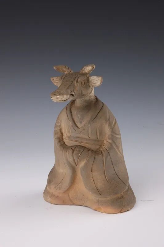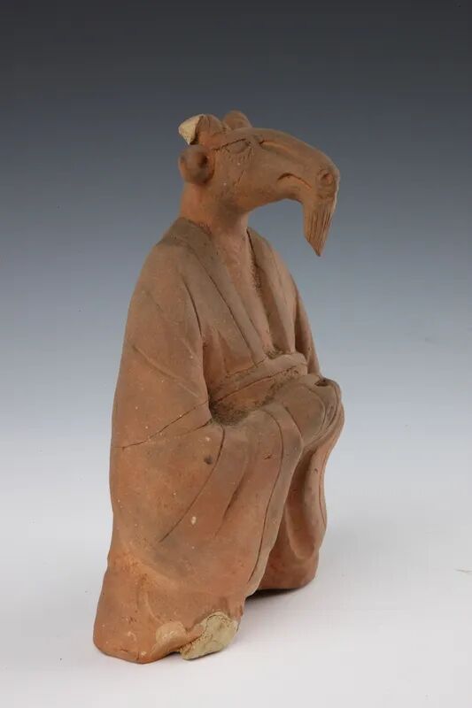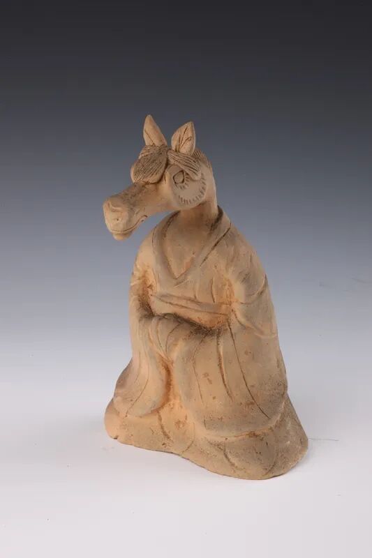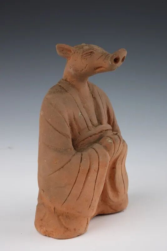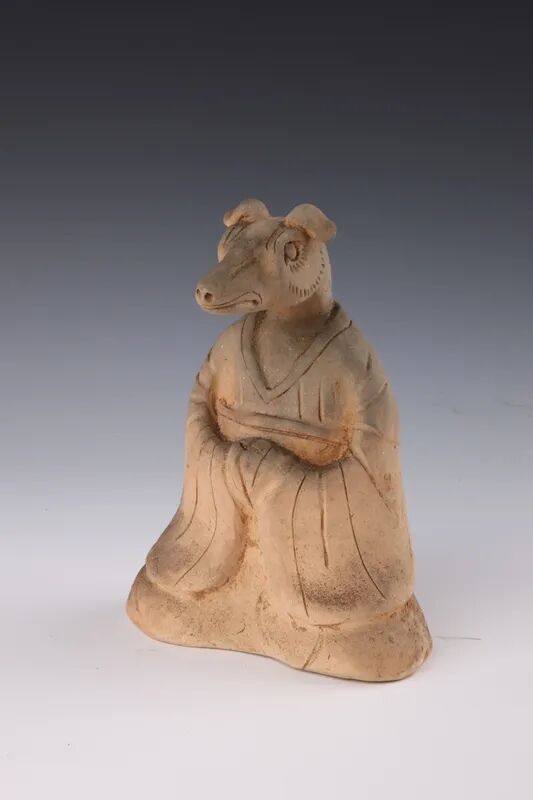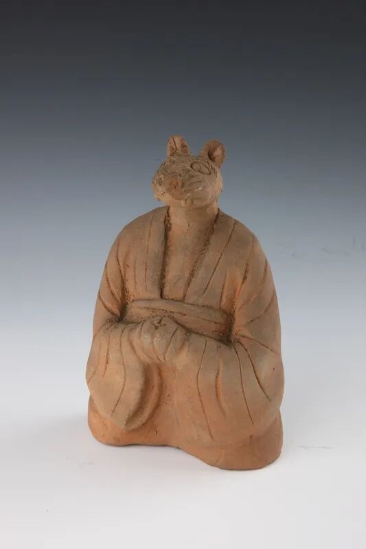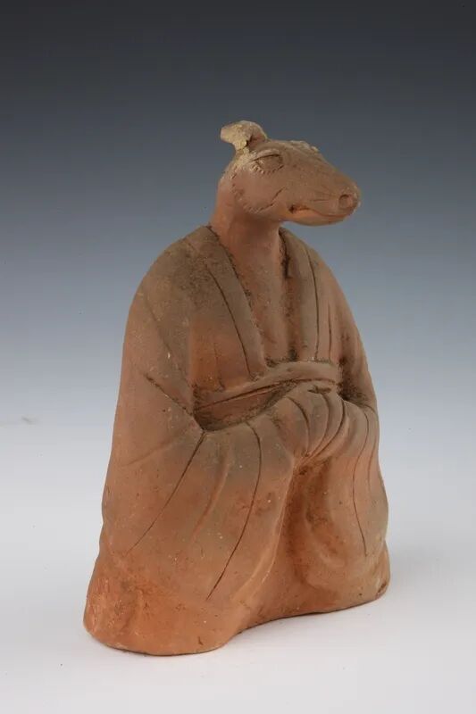 这组生肖俑出土于初唐墓葬中,原分置墓室左右小龛内,均为坐姿兽首人身,着宽袖长袍,胸下高束博带,双手置于胸前,手中执物已佚。这一造型始见于湖南湘阴隋墓出土青瓷者,后成为生肖俑的常见样式之一。