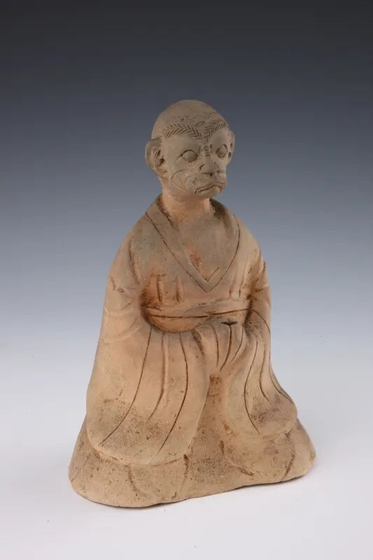 陶俑身着长袍,昂首站立,神态祥和、静谧,俨然人类守护之神。