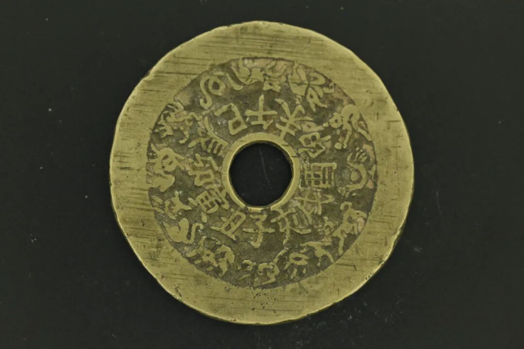 该铜钱一面为十二生肖图案,另一面为八卦图案,民间多视之为辟邪之物,也常作道教祈禳压胜所用,可供人玩耍佩戴,但不用于流通。