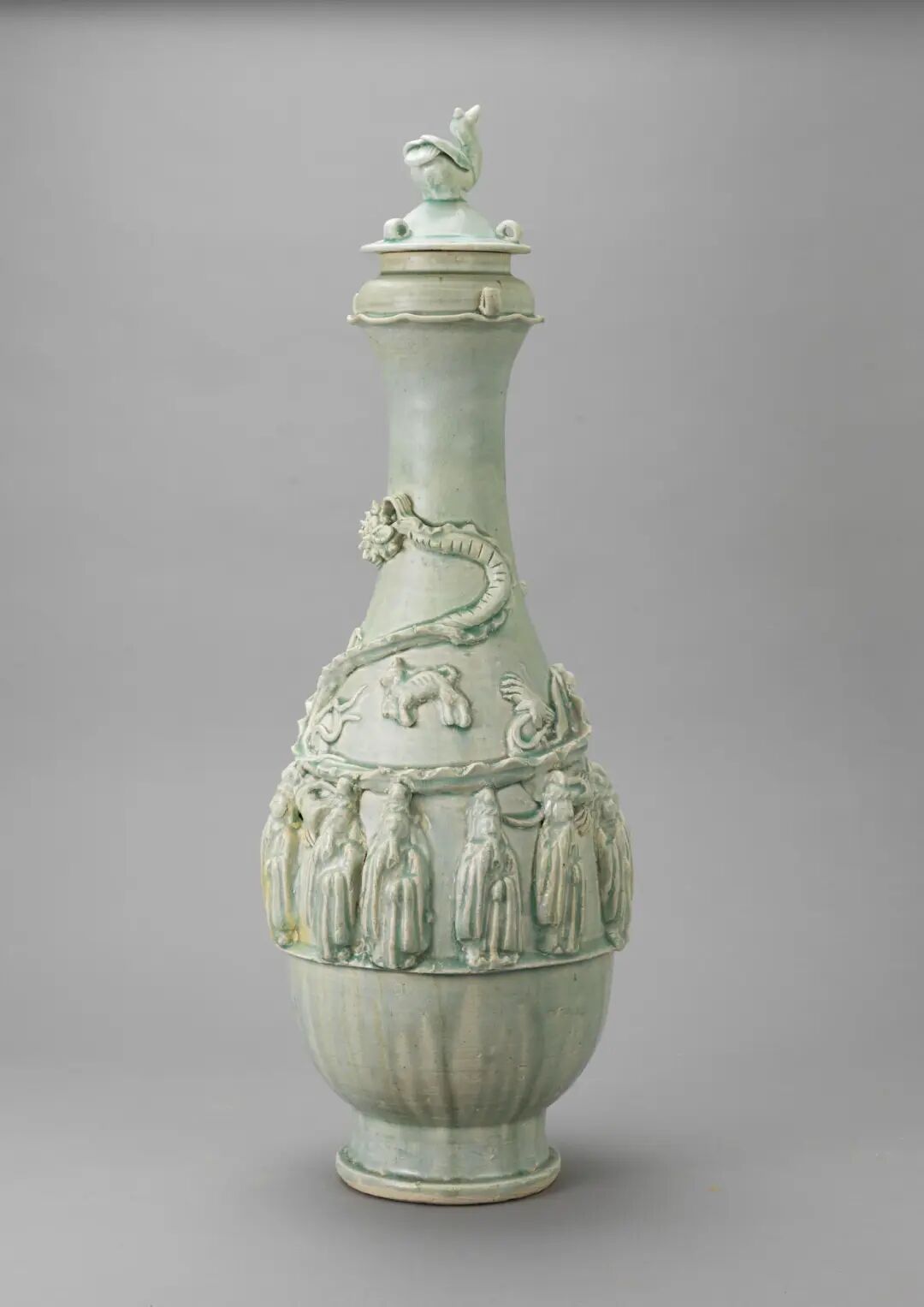 景德镇窑青白釉堆塑人物带盖魂瓶