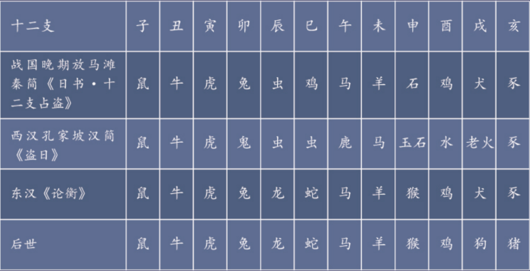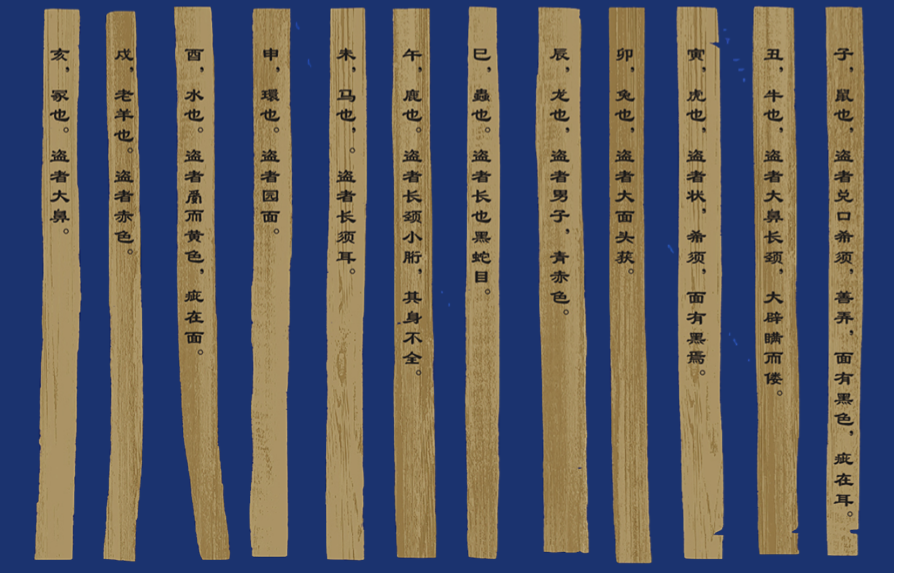 云梦睡虎地秦简《日书》用十二地支配以十二兽,来推测盗者的形象,所录十二兽名与今天流行的十二生肖不尽相同。