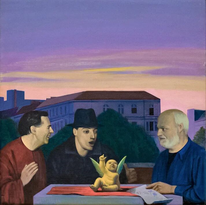 本作於劉野留德深造期間,劉野居住德國期間創作流傳下來的作品數量稀少,作品中可見西方藝術大師對其的種種影響,是市場上難能可見的珍品。《無題》畫面前景是三個神色各異的西方男人圍坐於桌前,中間桌面的小天使手指上空,三位男人頃刻之間得到醍醐灌頂之指引,紛紛露出或驚喜或震驚的神情,是作品中最為耐人玩味的元素。天使的出現同樣是劉野創作中標誌性符號之一。赤裸的嬰兒天使在藝術史中最早可追溯至文藝復興時期甚至中世紀的宗教繪畫,聖潔的嬰兒與天使結合,聖嬰手指向某處,彷彿為古老的哲思指出方向。《無題》是劉野在德國留學期間集其創作的大成,包括影響其深遠的包豪斯主義,同時啟發其往後十數年對西方構成主義思想的持續發展。