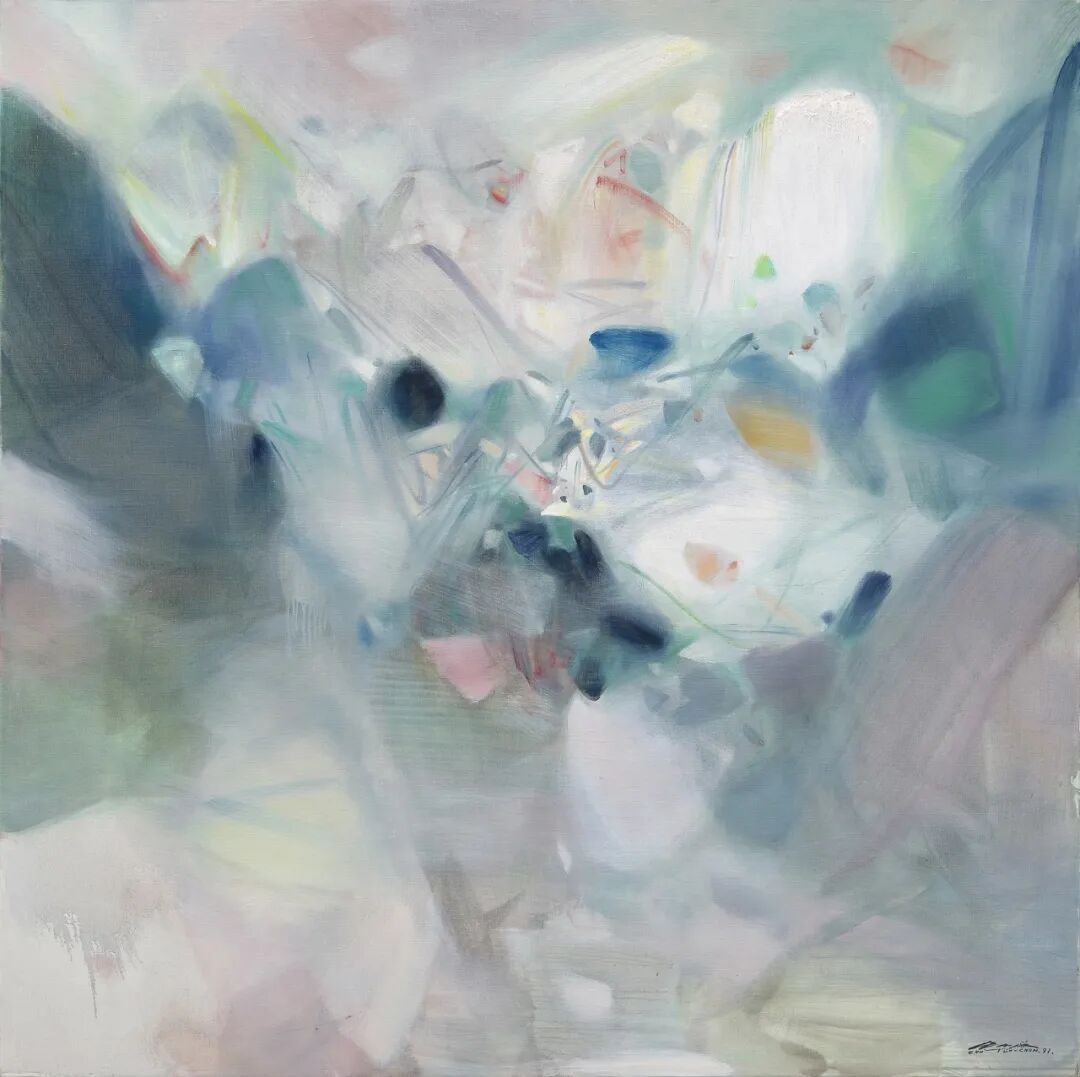創作《夢想的曙光》時,朱德群已邁入七十二知天命的年歲,他抹平了激烈厚重的油畫筆觸,細膩銜接了不同色彩,融匯了西方抽象色塊與中國山水筆墨的特色,交織成獨一無二的朱德群繪畫語言。在這幅作品中,藝術家大膽採用淡綠、粉紅、鮮黃、鮮紫到彩藍等繽紛色調,宛如不同的音符奏鳴,交織成一道夢想的曙光,使人眼前一亮。瑰麗的色彩層次表現了朱德群晚年舒坦樂觀、澹泊恬淡的心境,代表了中國人的理想精神境界。《夢想的曙光》展現了朱德群營造的一方新天地,透過藝術家精湛的創作力與豐富的學識,真正在畫布上描繪出氣象萬千的夢想世界。