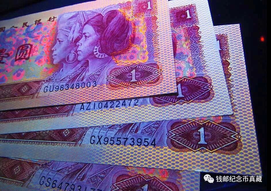 三版玩水印,四版玩荧光。四版的荧光代表绿幽灵、金背大红的金龙王、红金龙等等都是非常不错的品种。金龙王是全幅满版强荧光九色荧光,在放大镜下呈现三维立体,这是上辈人智慧的结晶。严重被低估,价值的洼地,将来有天会拨开云雾见青天的,四版荧光币中的黑金------金龙王。投资收藏两相宜,稳健安全的品种。