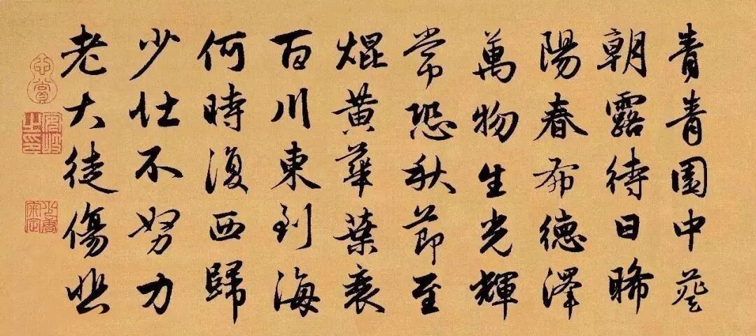 青青园中葵, 朝露待日晞。阳春布德泽,万物生光辉。常恐秋节至, 焜黄华叶衰。百川东到海, 何时复西归?少壮不努力, 老大徒伤悲。