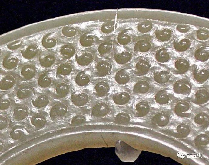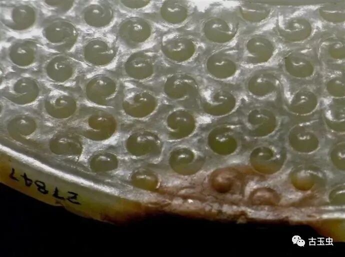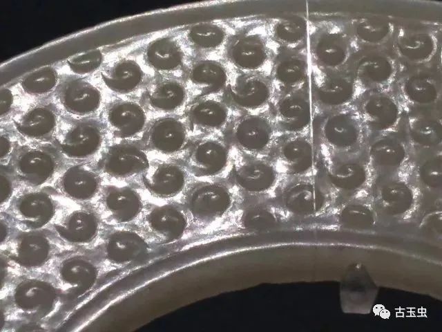 四、大家从图三、五、六这三张图片可以看到谷纹的排列和谷纹底部的特征。古代玉匠加工谷纹时,往往先在素璧上打出蒲格,再剔地加工出谷纹。因剔地加工的关系,谷纹的底部是起伏不平的,加工出的谷纹如镶嵌在玉璧之上,而现在做假的谷纹,往往底部水平,一般为合模或机雕或超声波震荡而成。