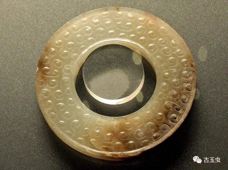 合模加工直接成型的,谷纹底部与平面夹角处会出现气泡,也有的会成型后进行手工加工修饰。机雕加工的谷纹,阴线无砣痕,宽窄、深浅完全一致,在谷纹底部会出现完全平行的水波纹,且多数做假者会在表面做上假灰皮,把水波纹盖住。大家在遇到这两种现象的谷纹玉璧,一定要擦亮眼睛。