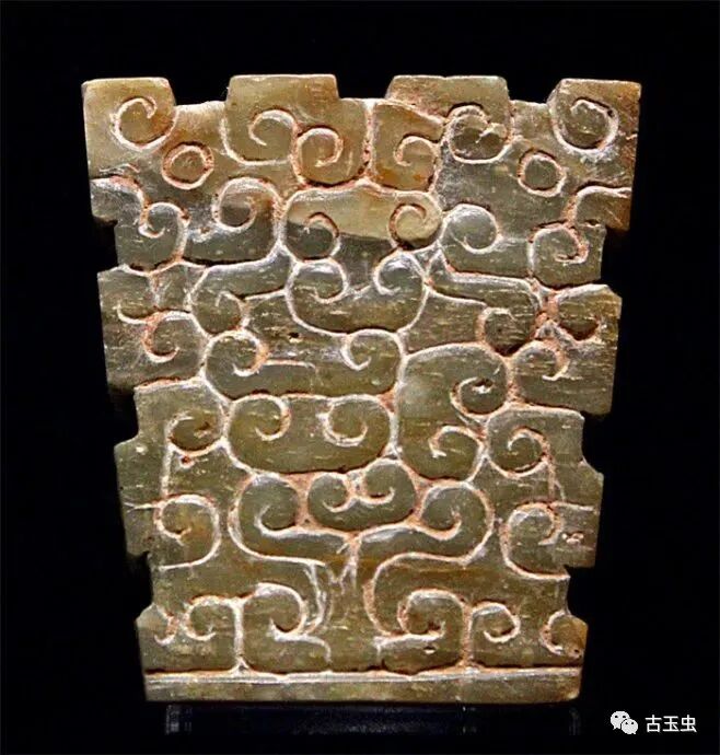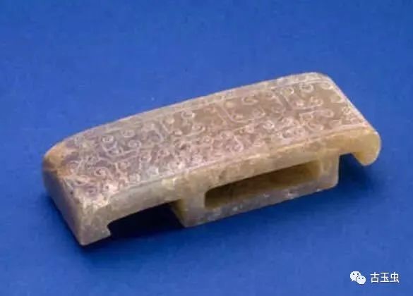 这也是一件上博馆藏的春秋龙纹牌,玉表无包浆。一般此种古玉玉质都不是很好,加工比较粗糙,抛光不够精细,纯粹作为葬玉来使用。此种古玉如果经过盘玩,玉内吸附的有机质析出,也会出现比较柔润的包浆。