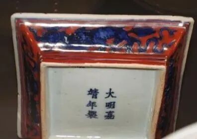 嘉靖五彩款识以青花六字双行楷书为主,皆书在器物底部,多数款字不带外框,少数外书双框或双圈。 此外,有的器物在口沿部位用青花书“大明永乐年制”、“大明年造”、“大明年制”、“大明宣德年制”、“大明成化年制”等款。 有的在器物底部用矾红书“外膳房”、“上用”、“大茶房”,也有“万福攸同”、“上品佳器”等吉语款识。
