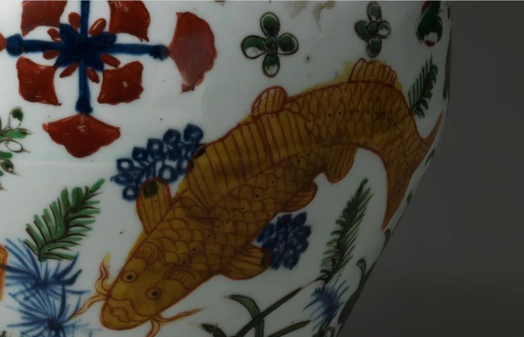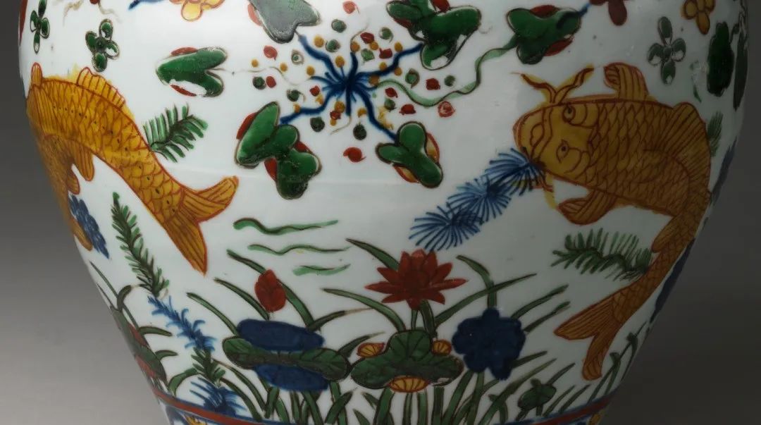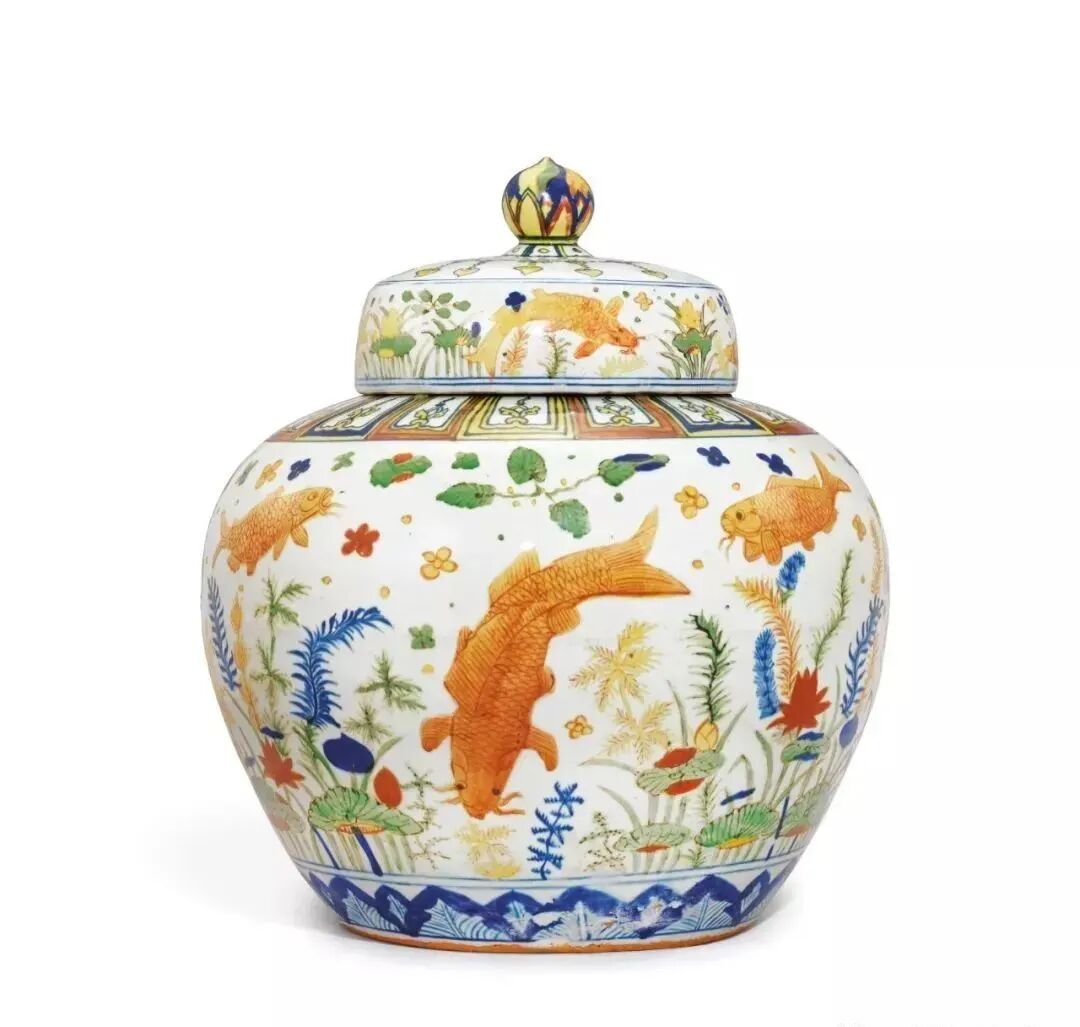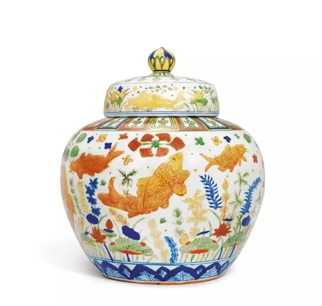 明嘉靖 五彩鱼藻纹盖罐 六字楷书款 2017年香港佳士得拍出 成交总额:213,850,000港币 (合人民币约1.8亿) 来源 胡惠春家族珍藏