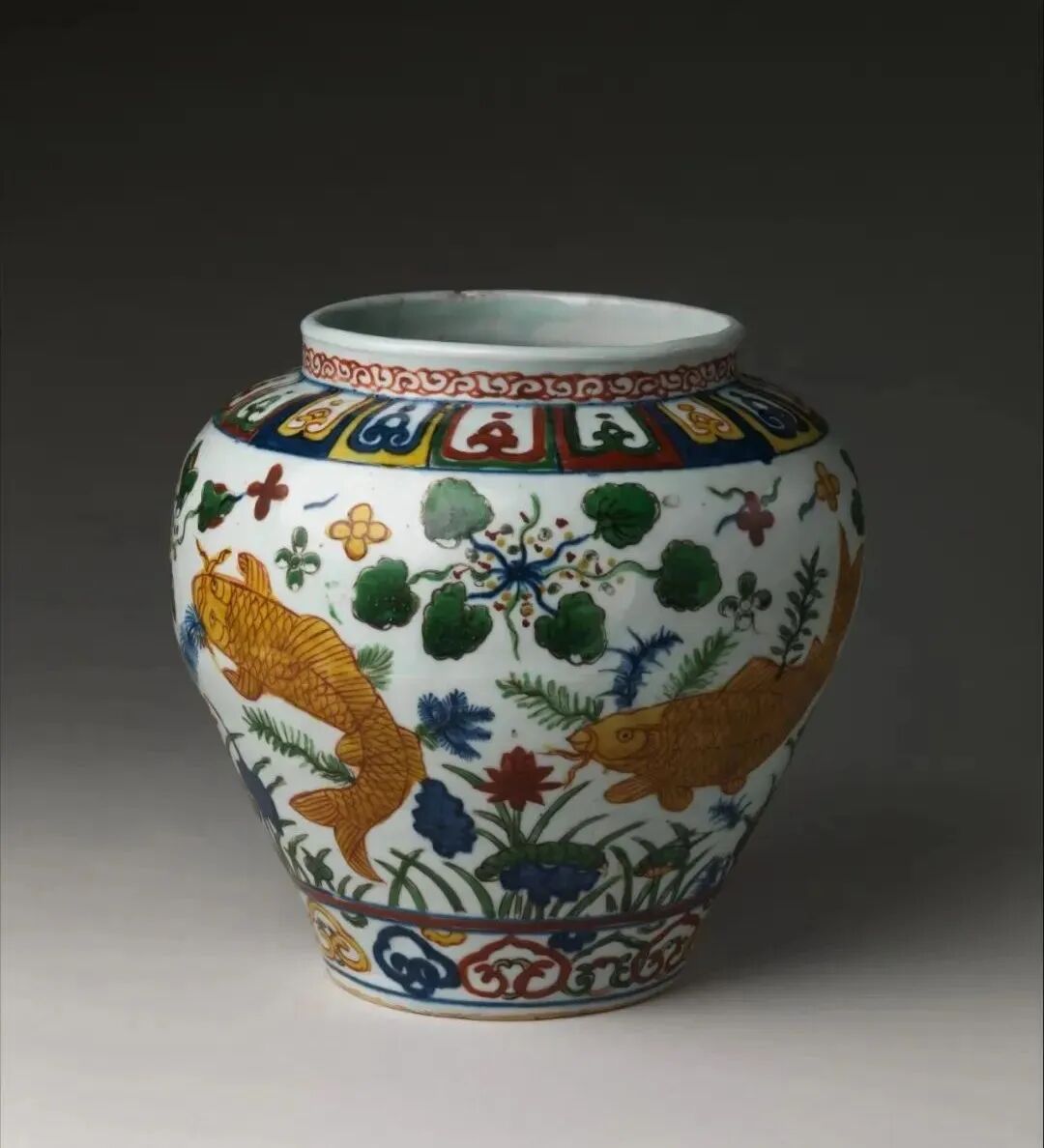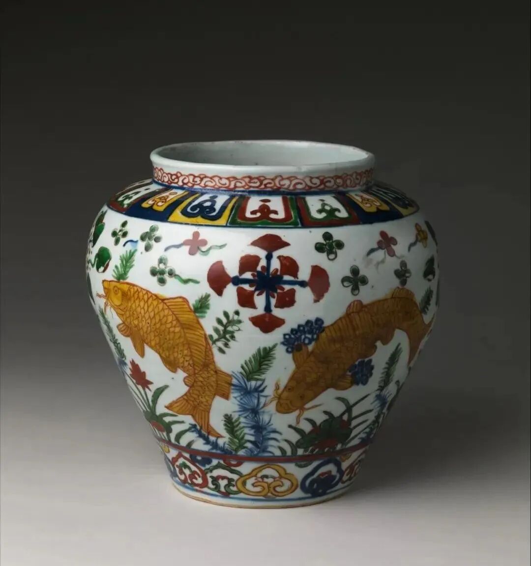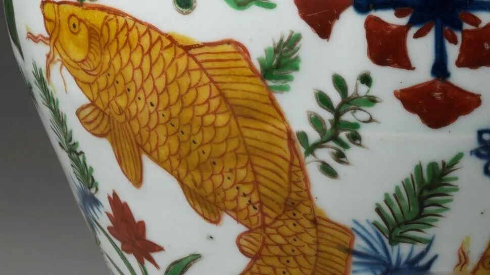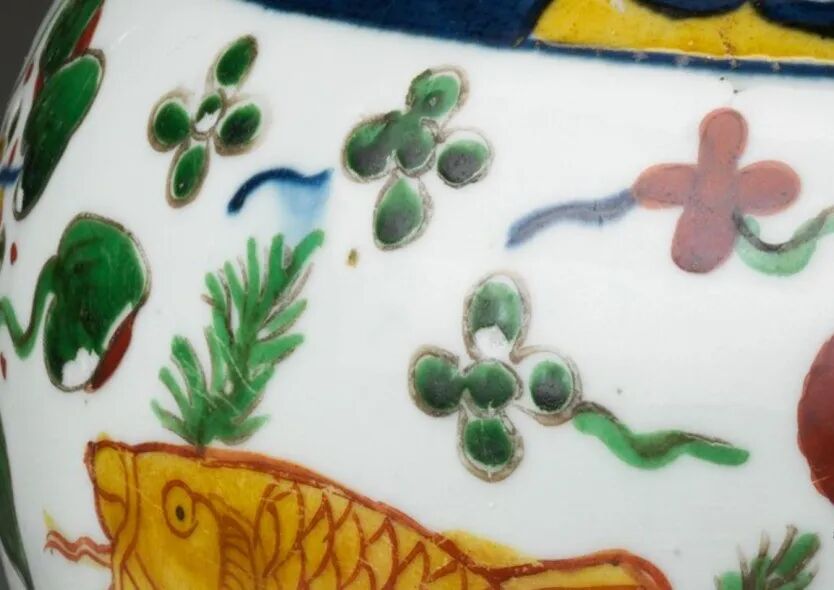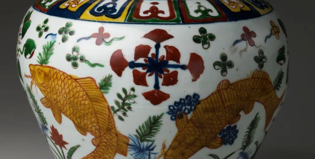明嘉靖 五彩鱼藻纹盖罐 六字楷书款 2017年香港佳士得拍出 成交总额:213,850,000港币 (合人民币约1.8亿) 来源 胡惠春家族珍藏