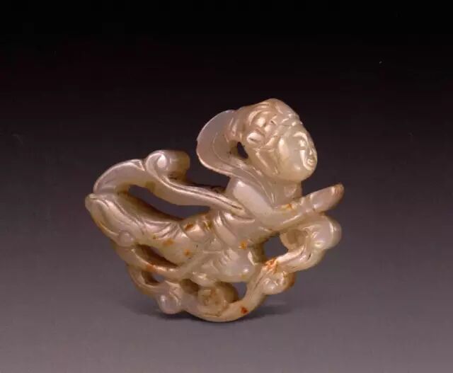 玉飞天,是唐代玉雕的新品种,唐代玉飞天一般体态丰腴,上体袒露,下身着紧贴于腿股的长裙,身下还有几条细长的透雕云纹或卷草纹。姿态曼妙轻盈,气韵清纯。佛教题材中的乾达婆与紧那罗,即天歌神与天乐神,为飞天形象的原型,因为飞天在佛教中被描绘成专采百花香露,能歌善舞,并向人间散花洒香,所以备受人们的喜爱。