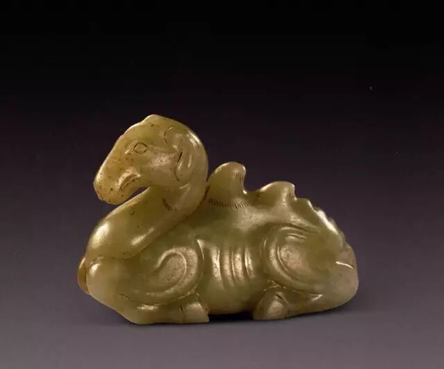 玉兽呈卧姿,头向前视,小头宽颈,圆圈眼,嘴稍尖。作者以简练的线条,勾勒出瑞兽浑圆的轮廓以及四腿弯曲的姿态,拙重敦厚,肉丰骨劲。