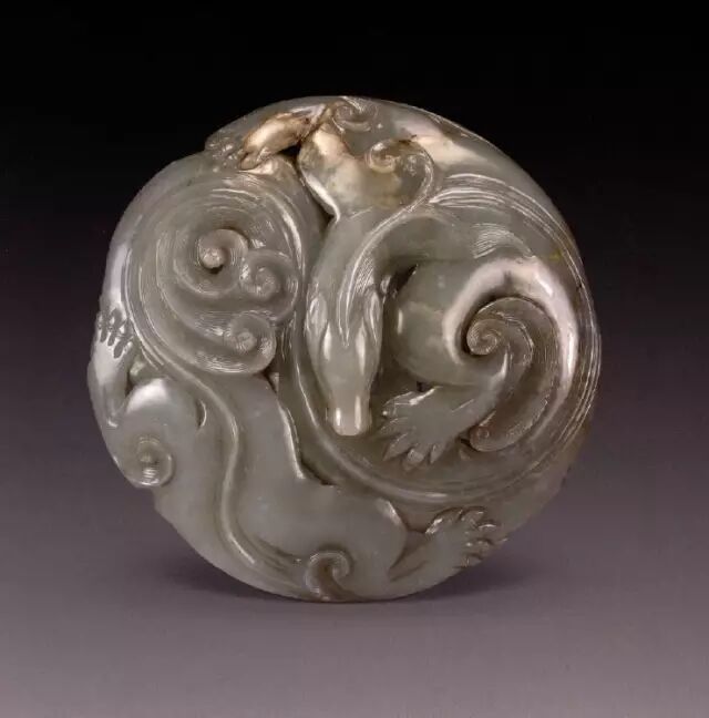 青灰色玉质。近圆形,正面圆凸,镂雕团龙搏击于湍急的漩涡之中,龙首细长,尖耳,长眼。阴刻长发及尖爪,四肢健硕,背面光素。气势磅礴。