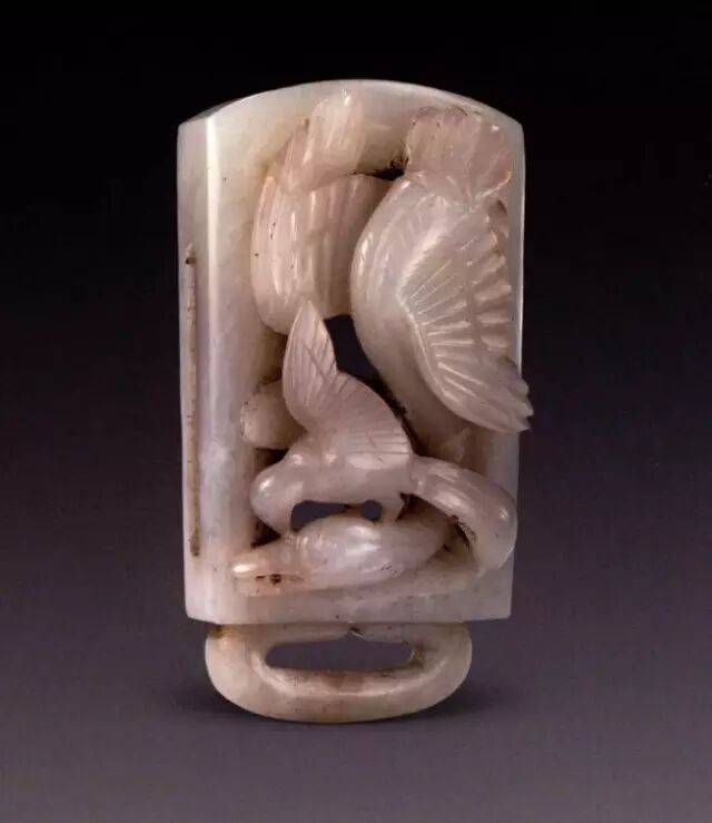 玉质灰白色,镂雕。长方形,一端有一扁环可悬挂物件,侧端有长方形穿带孔,主体纹饰雕琢鹘啄天鹅,风格粗放。造型构图均为典型的辽金风格,所饰图案颇具民族特色和地域特点,正是北方游牧民族春天纵鹰捕鹅的场景。