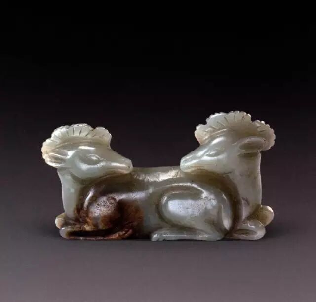 青玉质,玉质温润,带有黄色沁斑。厚片雕同身双鹿,头琢花形角,做回首相望状,背面有四对穿孔,做镶嵌之用。双鹿造型构思巧妙,展现出北方游牧民族鲜明的特色。