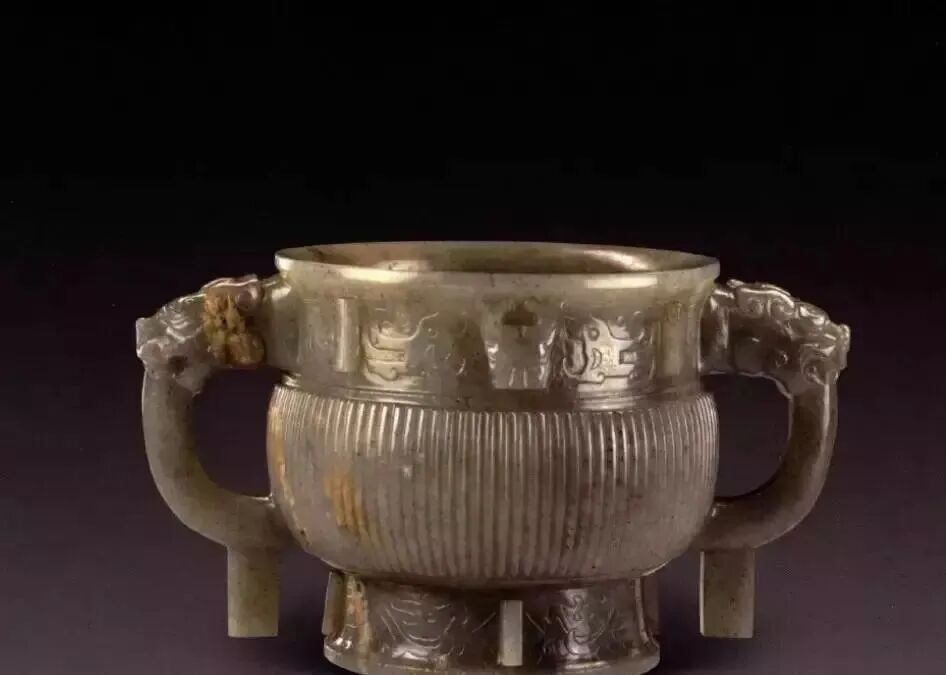 灰黑色玉质,多黑斑。器形仿西周青铜簋造型,腹饰直线纹,双耳饰兽头,颈及圈足饰夔龙纹。器形大气庄重、纹饰细致精美,乃明代仿古玉雕佳作。