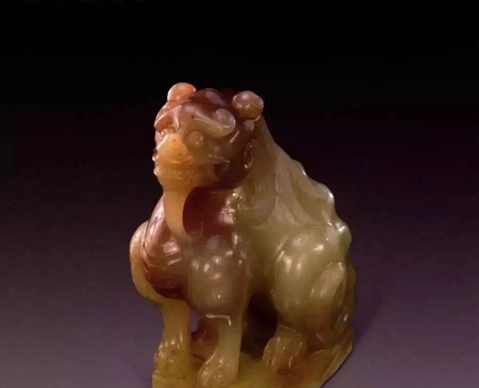 黄绿色玉质,有浅褐色沁。尖耳、凸眼、勾云形眉、有须。腮饰勾云纹,獠牙外露,毛发披散,挺胸抬首,脊背骨节凸起,尾翘卷。底部为六角平台,并对穿三孔。
