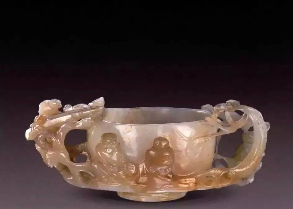 青白玉质。外腹一侧刻行书五言律诗一首。杯身及双耳雕松鹤、老人、童子。双耳采用镂雕工艺,表现出玉匠高超的雕刻技巧。松鹤是明清常用的装饰纹样之一,表现的是“松鹤延年”的主题,是明清时期非常流行的艺术题材。
