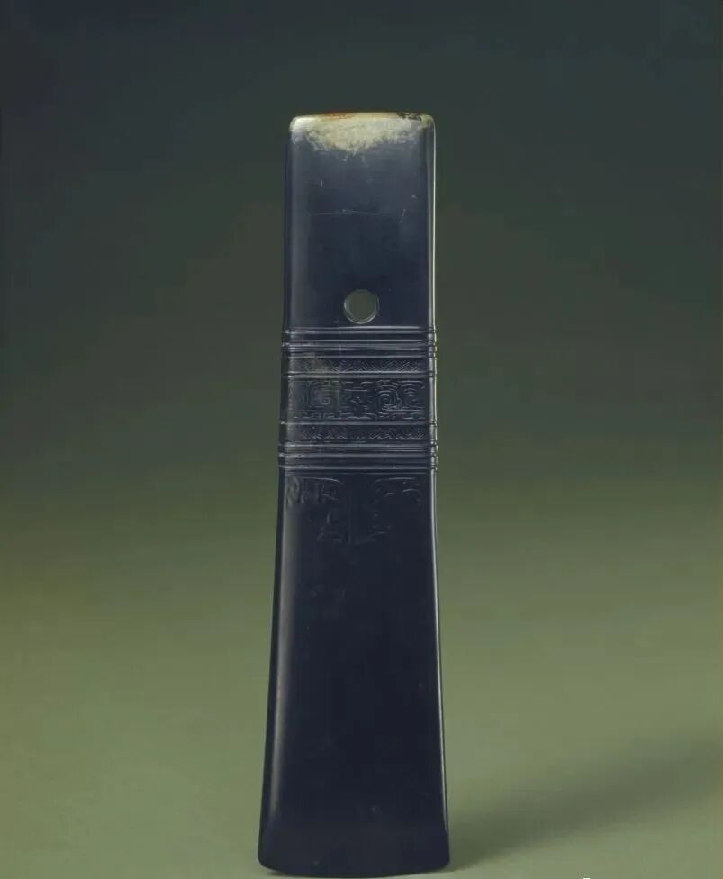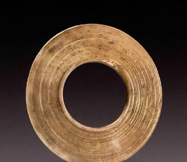 玉质青色,带有黄灰色沁色。璧体薄匀,孔缘起唇,两面各阴刻四组弦纹。类似器物在河南安阳殷墟妇好墓亦有出土。