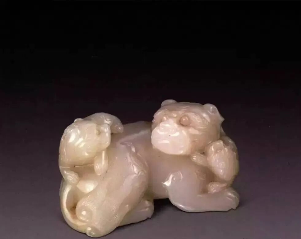 灰白色玉质。圆雕卧式子母狮。大狮回首,其胸前背上各有一小狮,雕工精细,骨骼肌肉感强,三狮温顺可爱,象征吉庆喜气。